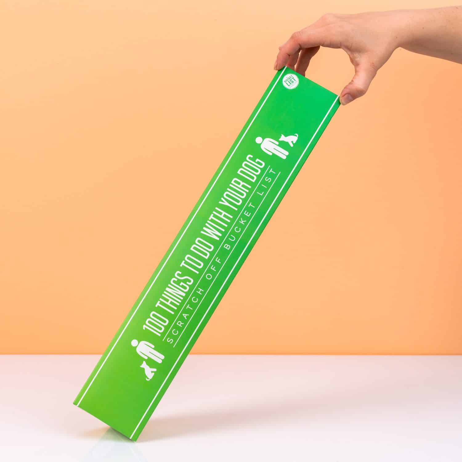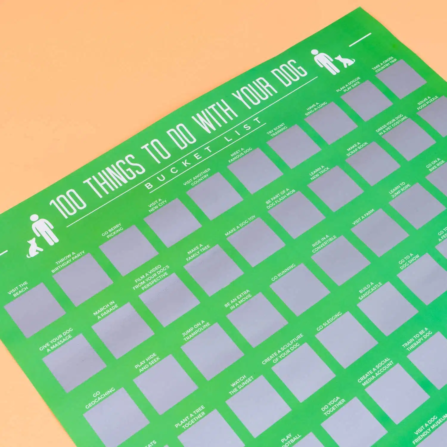 Samen sleeën, de zonsondergang bekijken of hondenkoekjes bakken: op de 100 Things to do with your dog krasposter van Gift Republic staan honderd bucketlist items om met je honden te doen. Heb je een activiteit gedaan? Dan kras je de zilverfolie van het bijbehorende vakje. Hieronder vind je een toepasselijke afbeelding. Zijn jij en je hond klaar om een wereldrecord te verbeteren?