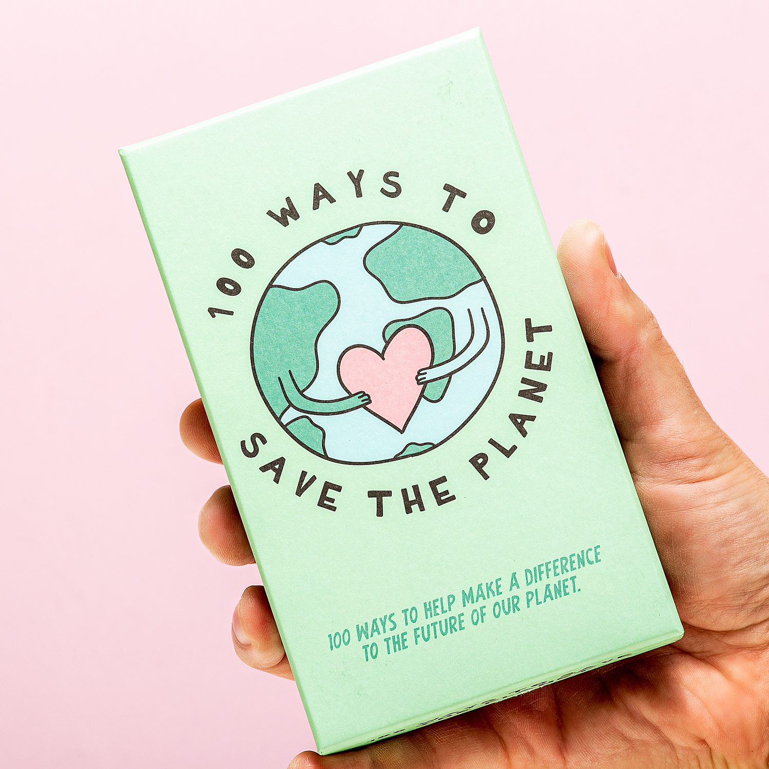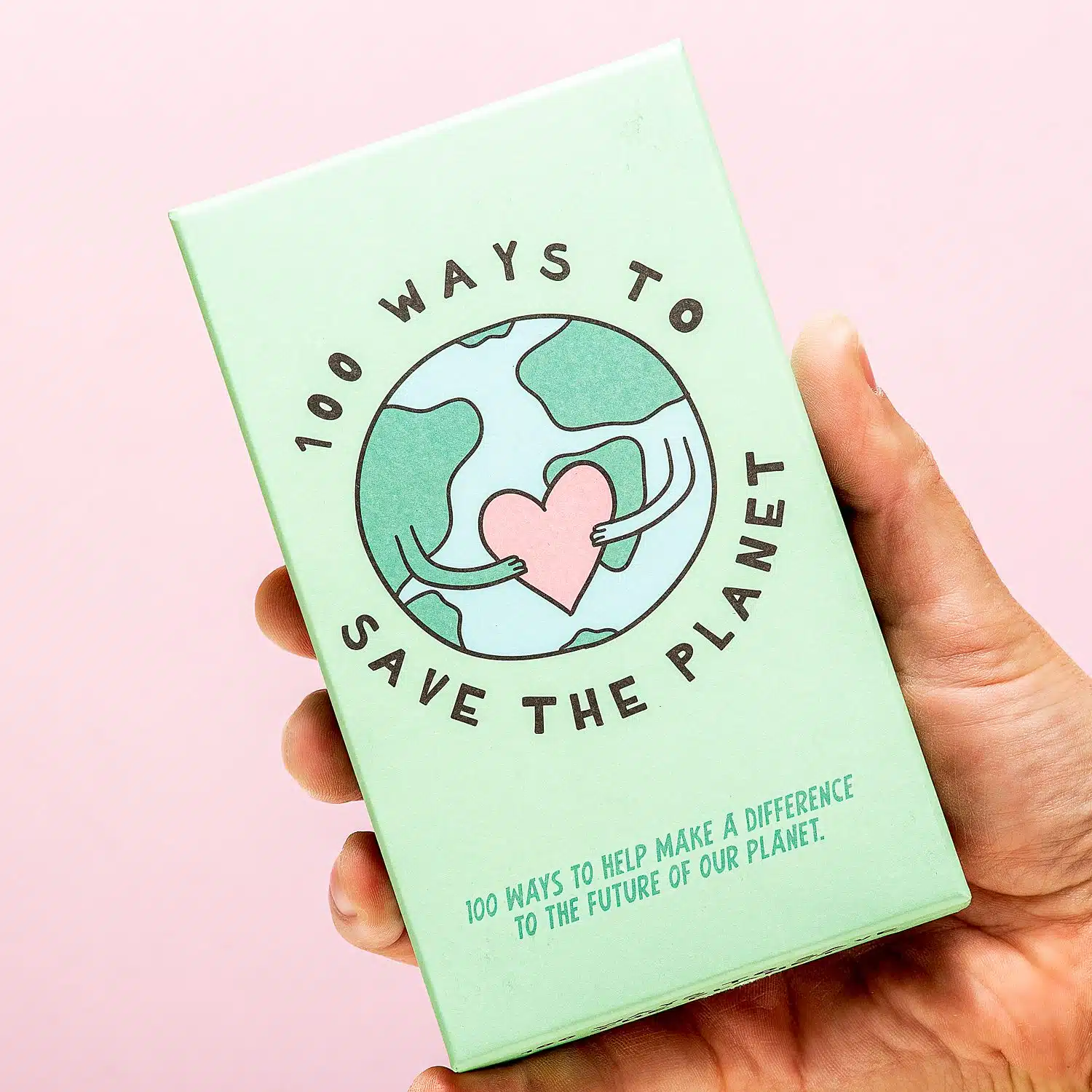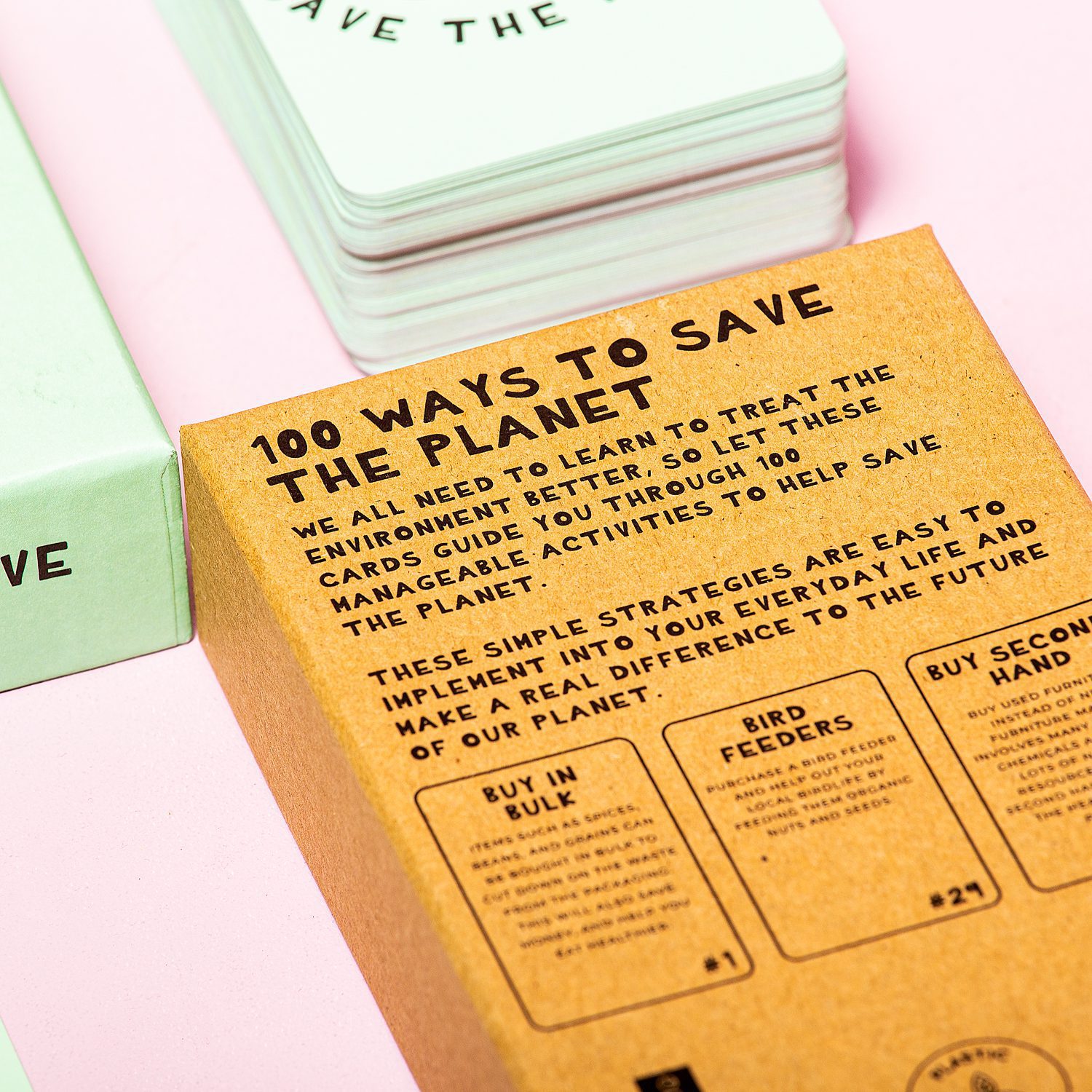 Gebruik shampoo bars in plaats van flessen. Kies voor een e-ticket. Zomaar twee tips die bijdragen aan een beter milieu. De 100 Ways To Save The Planet kaarten van Gift Republic laten je bewuster nadenken over het milieu en de toekomst van onze aarde. De honderd kaarten geven je praktische tips. Sommigen doe je misschien al, anderen gaan jou misschien te ver, maar je zult er ook zeker heel veel nuttige tips uit halen. De tekst is in het Engels.