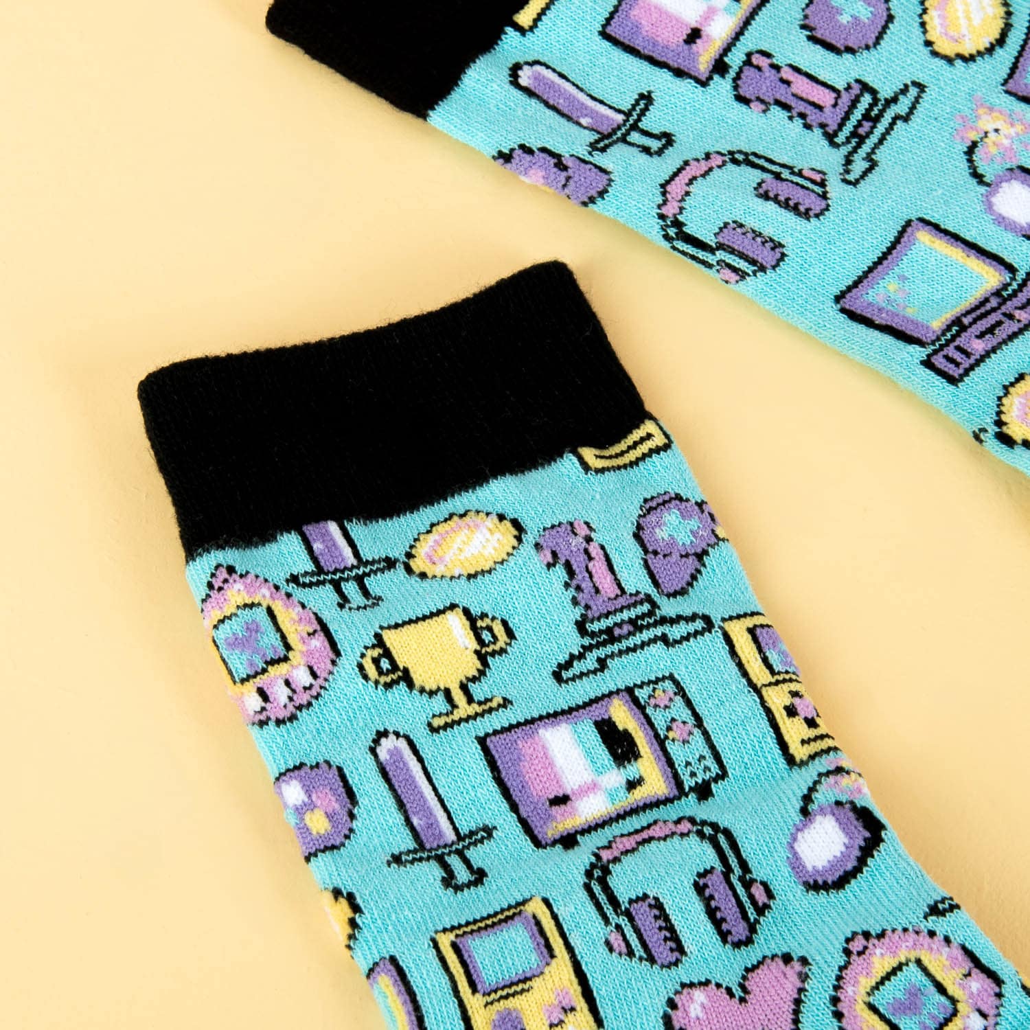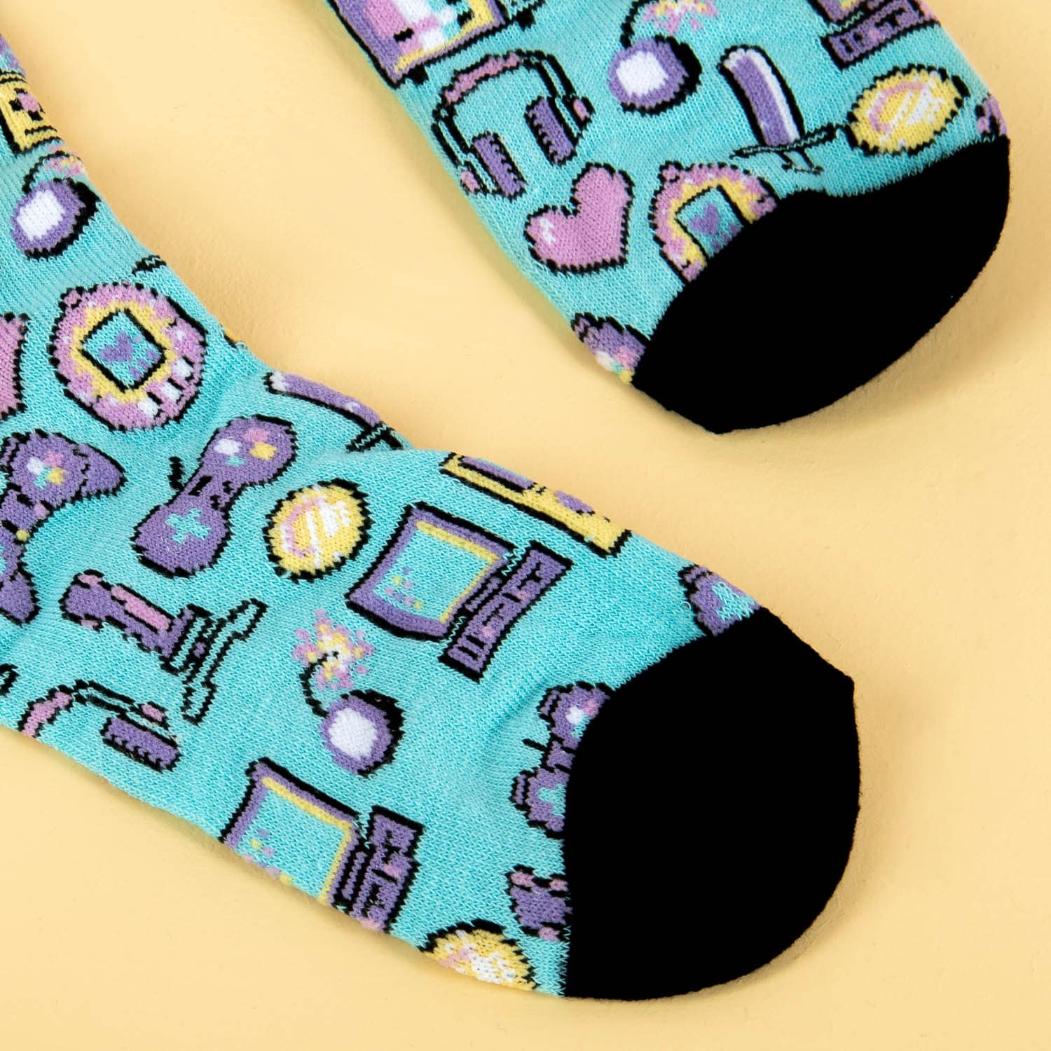Voor iedereen die met veel plezier terugdenkt aan de jaren 90 hebben we iets leuks: deze 90s gaming sokken. De sokken hebben niet alleen iconen uit die tijd, zoals de Tamagotchi, Nintendo en televisie met testbeeld, maar ook de opvallende kleuren uit die tijd. Leuk om cadeau te geven aan je nostalgische vriendin!