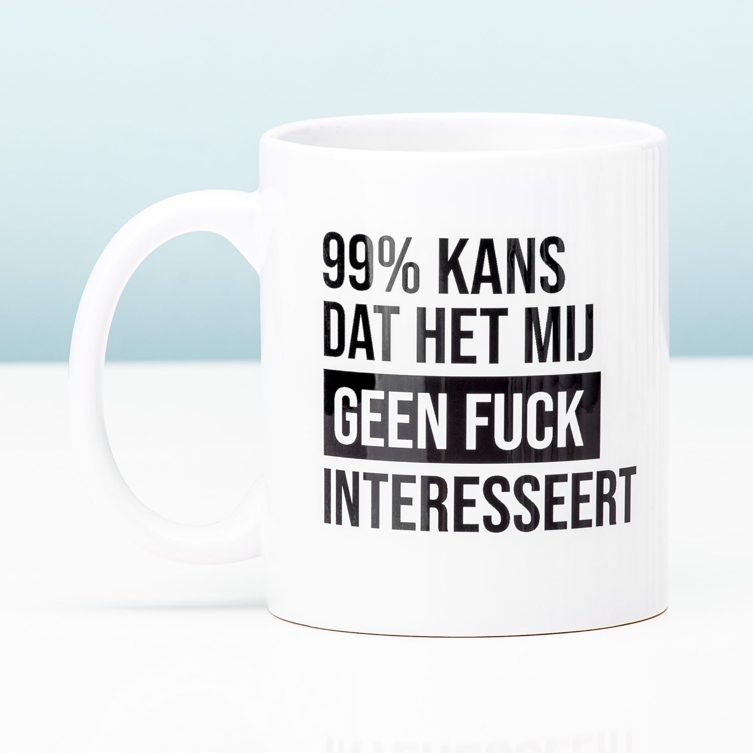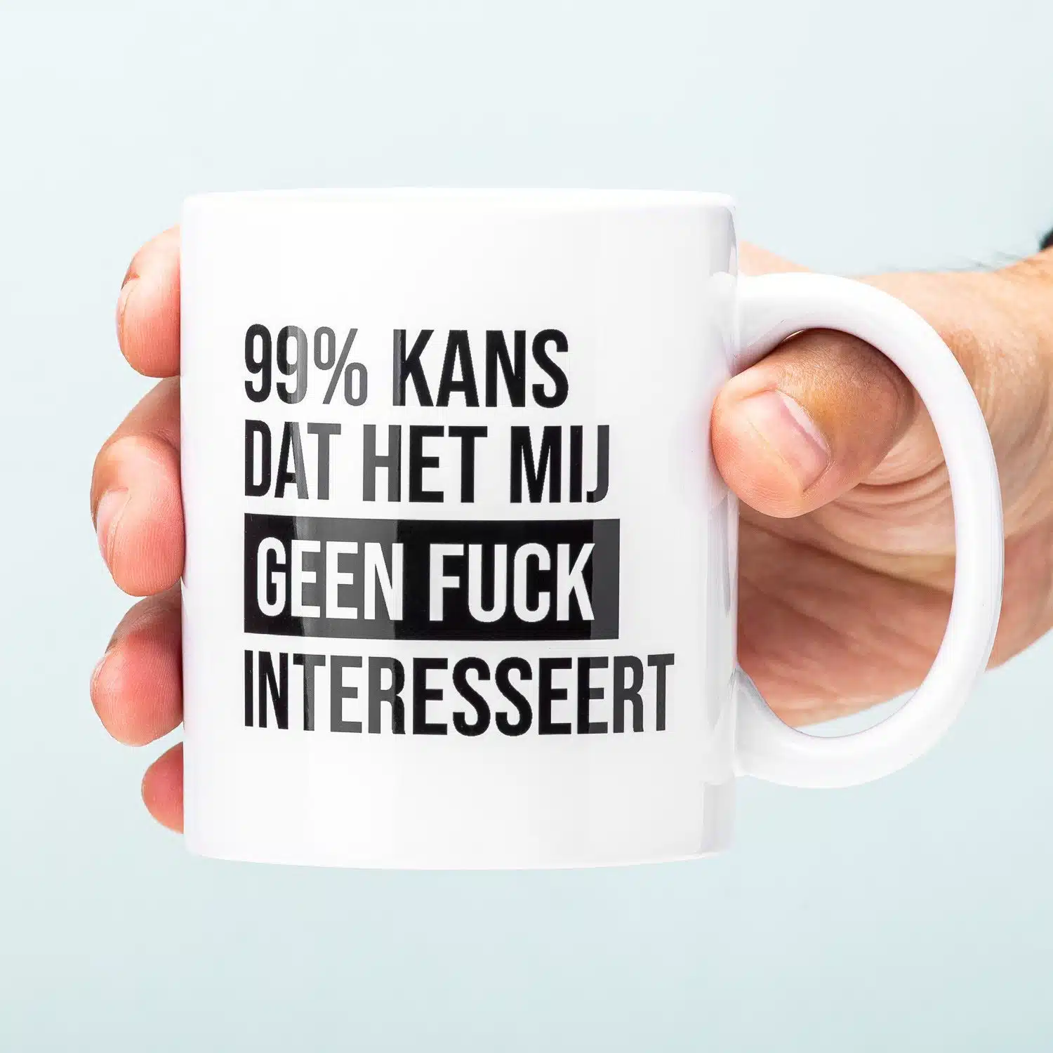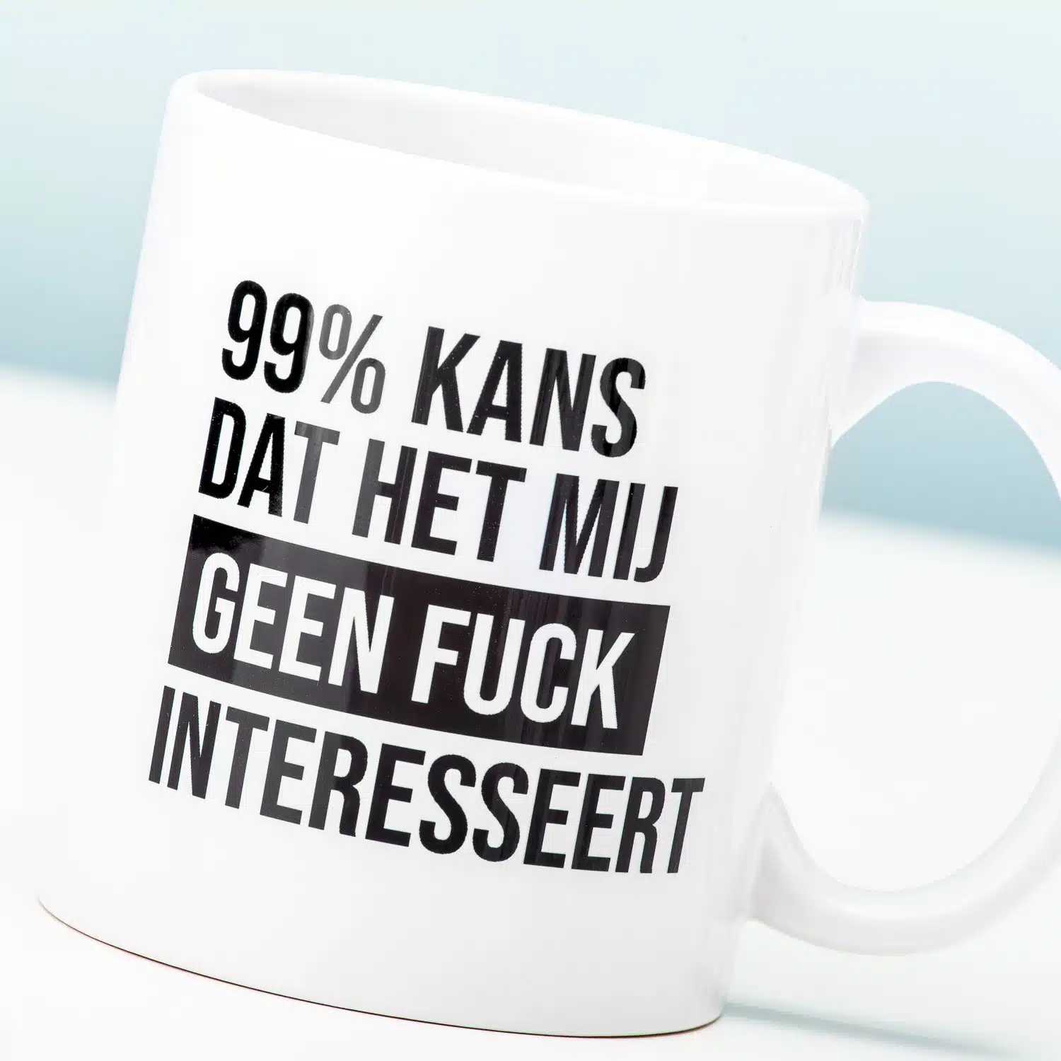 Geen zin in de babyverhalen van je vriendin? Kan het je weinig schelen wat je collega’s te vertellen hebben in een vergadering? En luister je liever niet naar jouw docent? Met de 99% kans mok maak je iedereen kenbaar hoe interessant je hun verhalen vindt. Op de beker staat de tekst: 99% kans dat het mij geen fuck interesseert. Lekker duidelijk, toch?