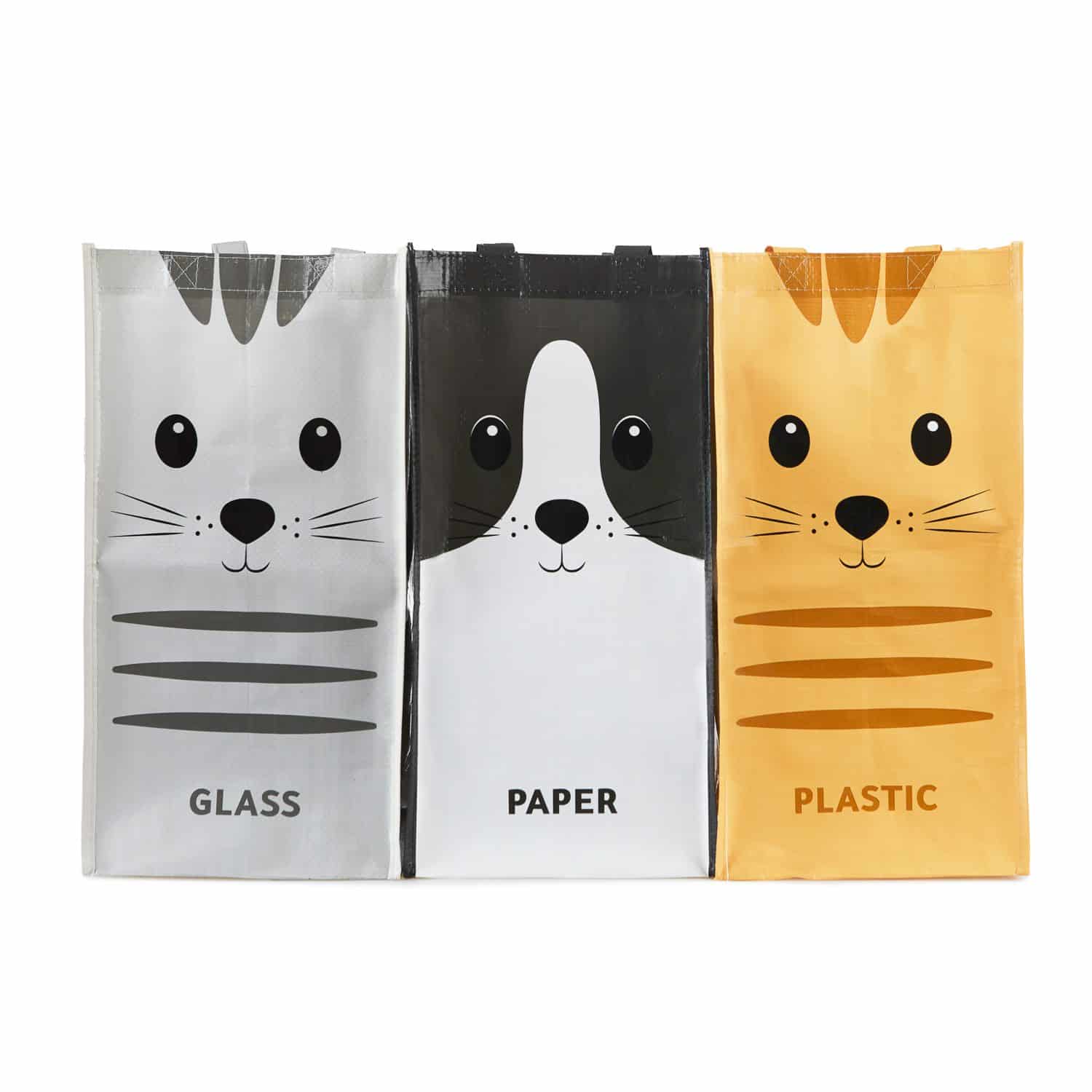 Als je in een flat woont, dan staan de afvalcontainers meestal niet heel dichtbij. Het is makkelijker om al je afval in dezelfde prullenbak te gooien, maar dat is natuurlijk echt niet meer van deze tijd. Met de Afval recycletassen met kat van Balvi kan iedereen die klein of hoog woont, toch makkelijk afval scheiden. De tassen, met elk een illustratie van een kat, zijn geschikt voor het verzamelen van glas, papier en PMD. Je neemt ze eenvoudig mee naar de glas- of papiercontainer, door de handvatten. Om het goede voorbeeld te geven, zijn de tassen gemaakt van gerecycled plastic.