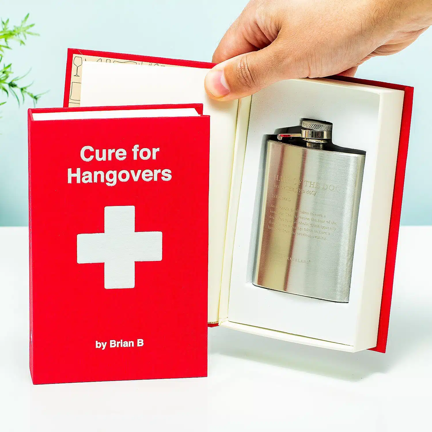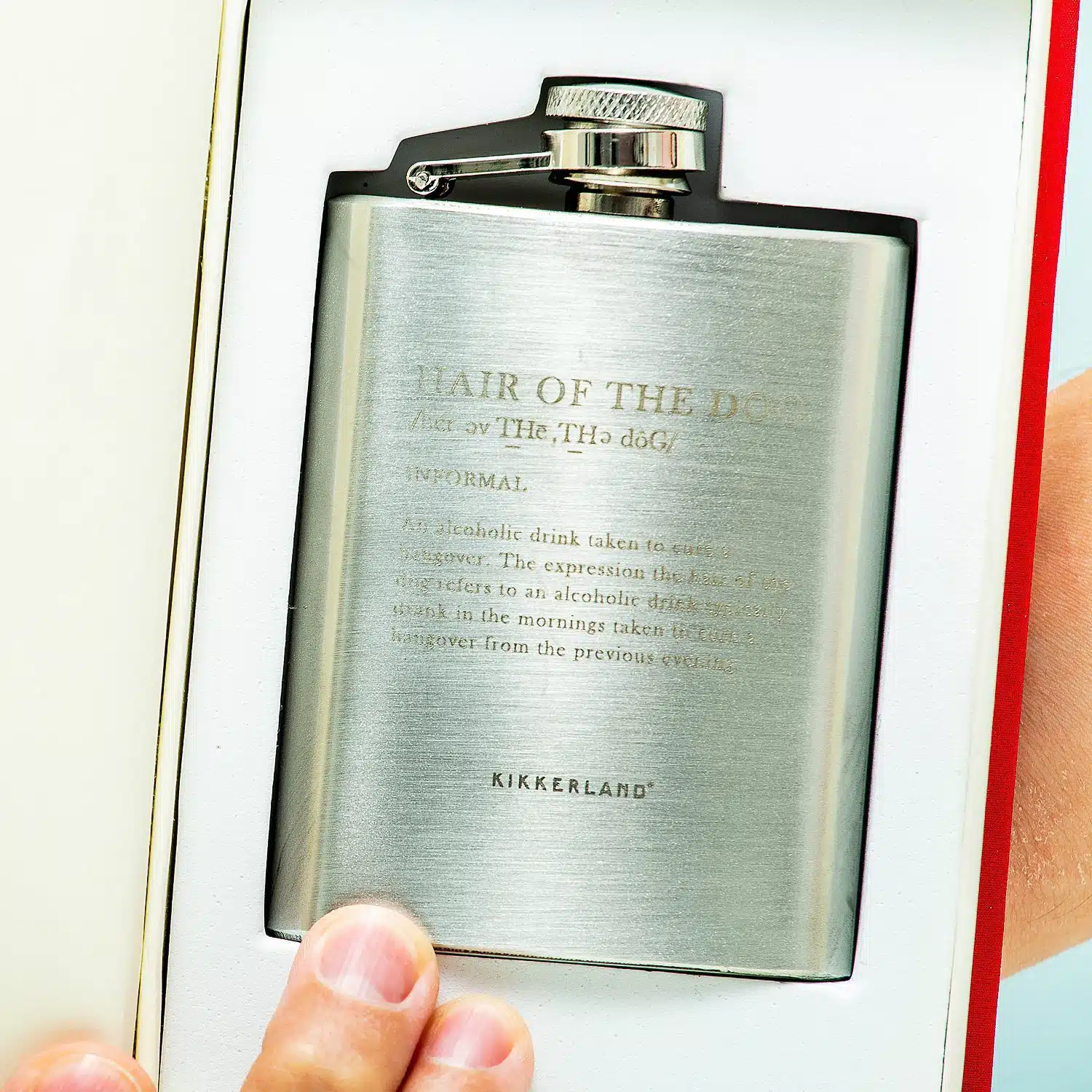 Wat is de beste manier om een kater te bestrijden? Volgens de Engelsen is dat ‘hair of the dog’, oftewel: een beetje alcohol drinken met als doel dat je kater weggaat. Het Anti-kater boek met geheime heupflacon van Kikkerland lijkt in eerste instantie een echte boek, maar in werkelijkheid zit er een heupflacon in verstopt. Met de opdruk: hair of the dog. Perfect voor mensen die graag direct weer door willen feesten.