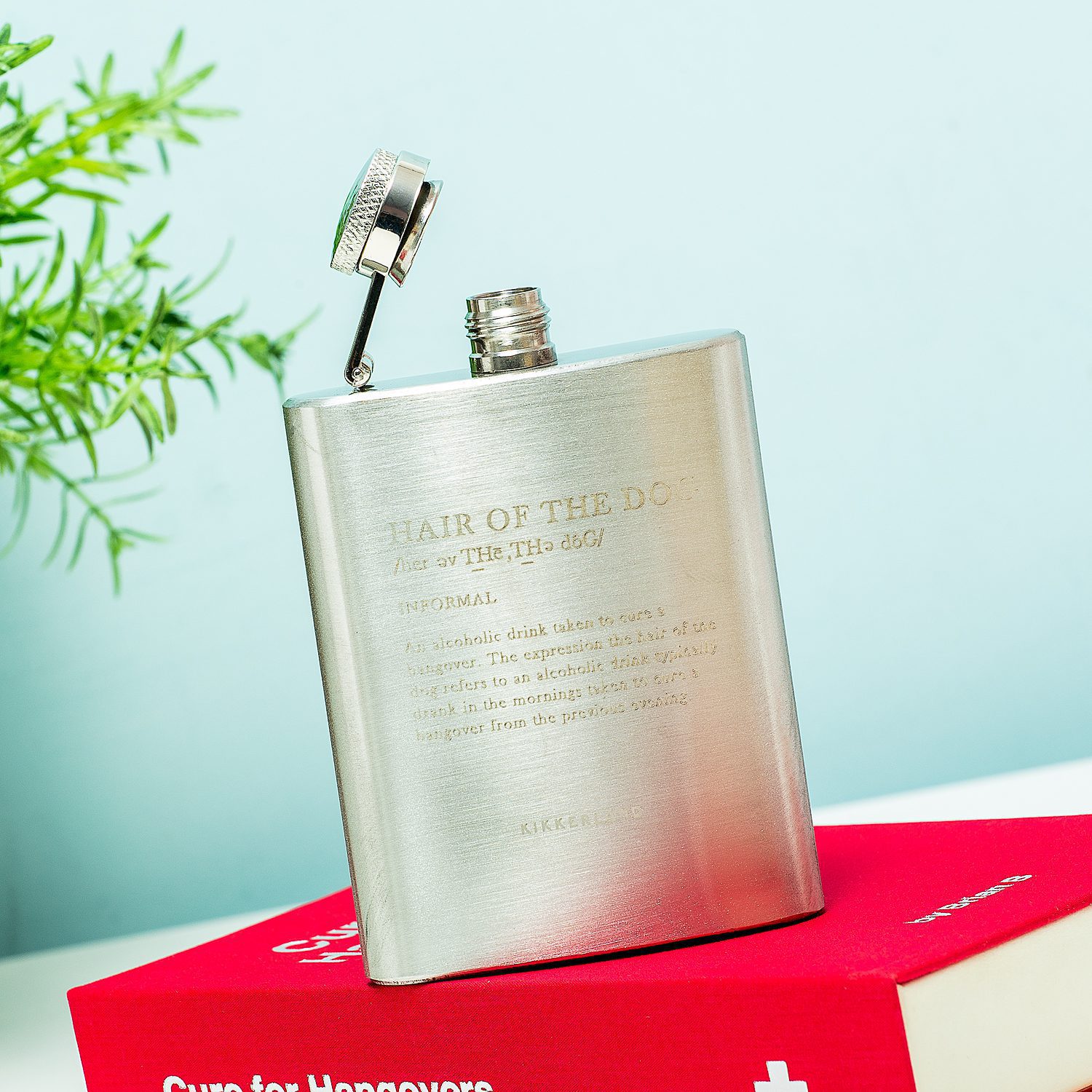 Wat is de beste manier om een kater te bestrijden? Volgens de Engelsen is dat ‘hair of the dog’, oftewel: een beetje alcohol drinken met als doel dat je kater weggaat. Het Anti-kater boek met geheime heupflacon van Kikkerland lijkt in eerste instantie een echte boek, maar in werkelijkheid zit er een heupflacon in verstopt. Met de opdruk: hair of the dog. Perfect voor mensen die graag direct weer door willen feesten.