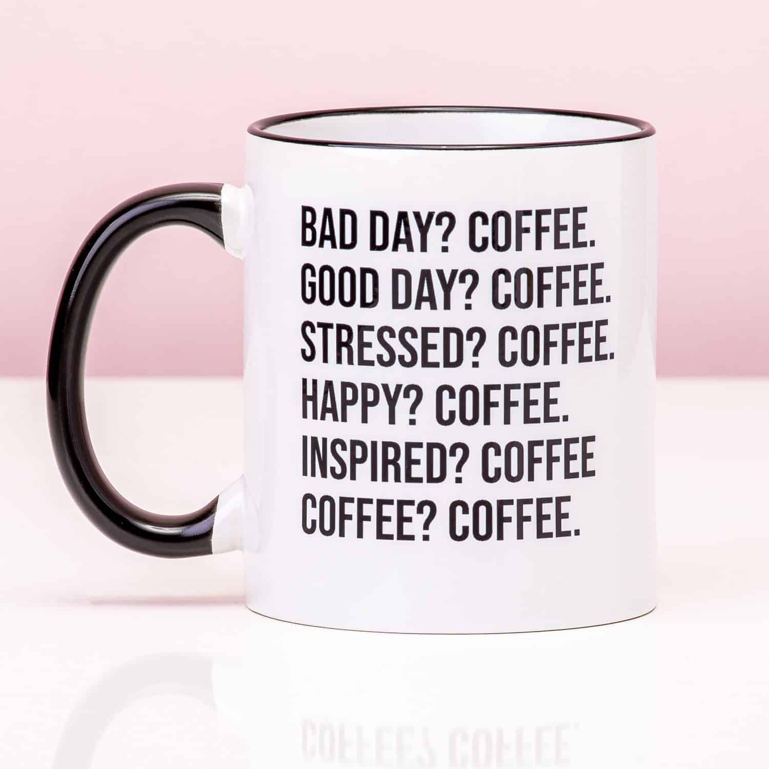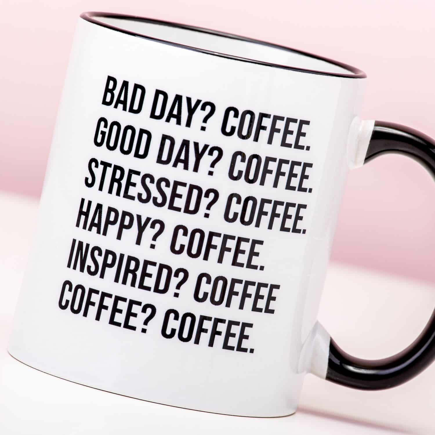 Ben jij helemaal weg van koffie? Of zoek je een persoonlijk cadeau voor een coffee lover? De Bad Day koffie mok is het antwoord op al je vragen. Deze grappige beker heeft een tekst, waaruit blijkt dat koffie alles beter maakt. Bad day? Coffee. Good day? Coffee. Stressed? Coffee. Happy? Coffee. Inspired? Coffee. Coffee? Coffee. Oftewel: koffie is altijd een goed idee, of je nu een geweldige of een slechte dag hebt. Deze unieke mok sleept je door de werkdag, maar is ook een prima beker tijdens het kijken naar een film.