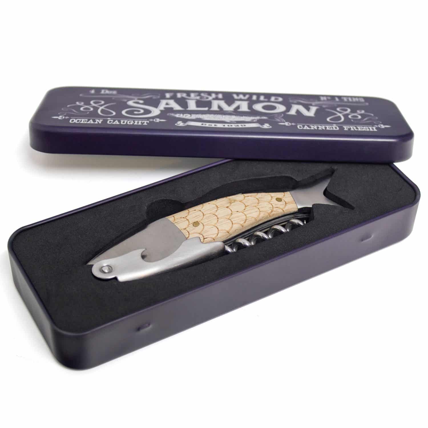 Ben je op zoek naar een cadeau voor iemand die wel een drankje lust? Met de Zalm kurkentrekker in cadeaublik van Balvi heb je een leuk en origineel cadeautje in handen. Deze kurkentrekker in de vorm van een zalm ziet er niet alleen heel leuk uit, hij is ook nog praktisch. Je kunt er flessen mee ontkurken, maar hij is ook voorzien van een flesopener voor kroondoppen. Bovendien heeft hij een mesje om folie open te snijden. En als klap op de vuurpijl zit de kurkentrekker in een heel leuk cadeaublik, waardoor het lijkt alsof er echte zalm in zit. Naar het perfecte kado hoef je niet langer te zoeken.
