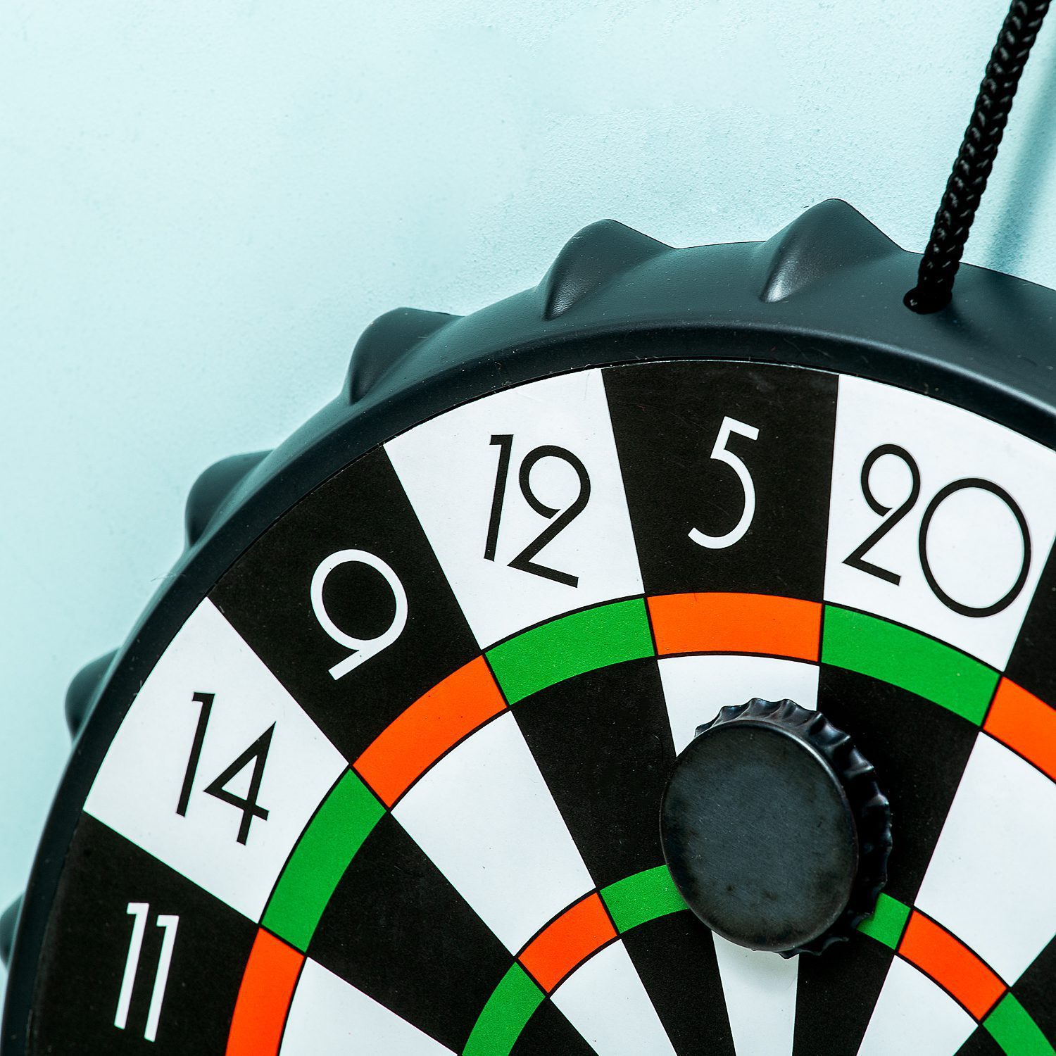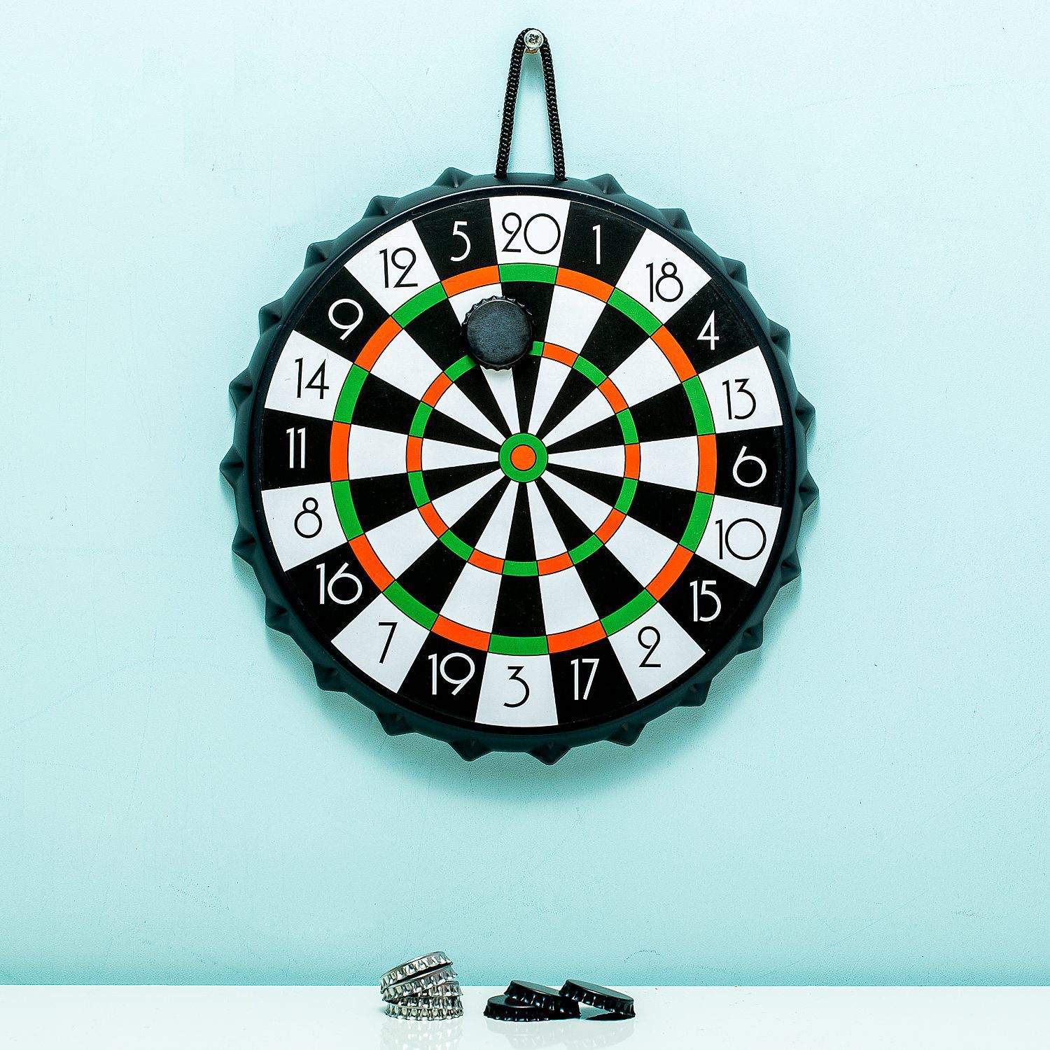Lekker even darten, maar liever zonder gaten in je muur te maken? Het Bierdopjes dartboard is hier perfect voor! Dit dartbord is een musthave voor studenten en mannen die een heuse mancave in huis hebben. Je gooit met de meegeleverde bierdopjes op het bord en probeert op die manier zoveel mogelijk punten te scoren. Het dartboard kan staan of opgehangen worden.