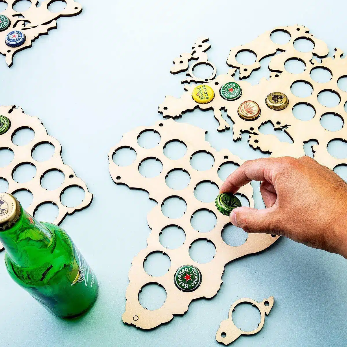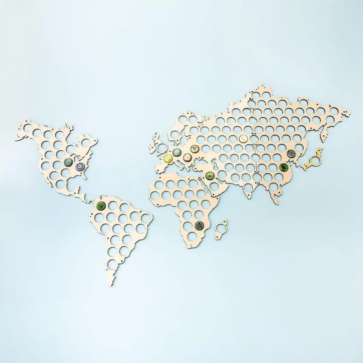 Zoek je een cadeautje voor een bierfan? Drinken jij en je vrienden elke vrijdag een krat bier leeg? Of zijn jullie op het werk helemaal fan van speciaalbier? Met de Bierdopjes wereldkaart kun je precies zien wat je de afgelopen tijd allemaal gedronken hebt. Deze wereldkaart van hout heeft ruimte voor maar liefst 296 bierdopjes! De wereldkaart heeft verschillende losse onderdelen. Als je ze op de juiste manier ophangt is de kaart ongeveer 150 x 91 centimeter groot.