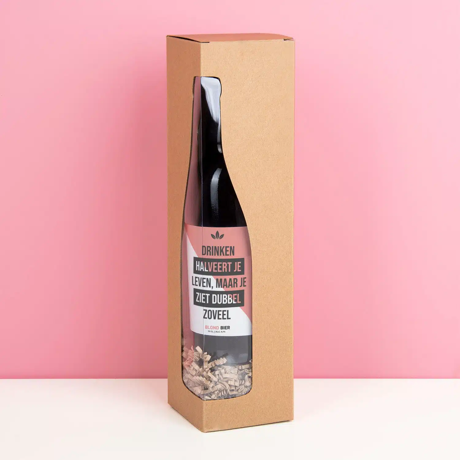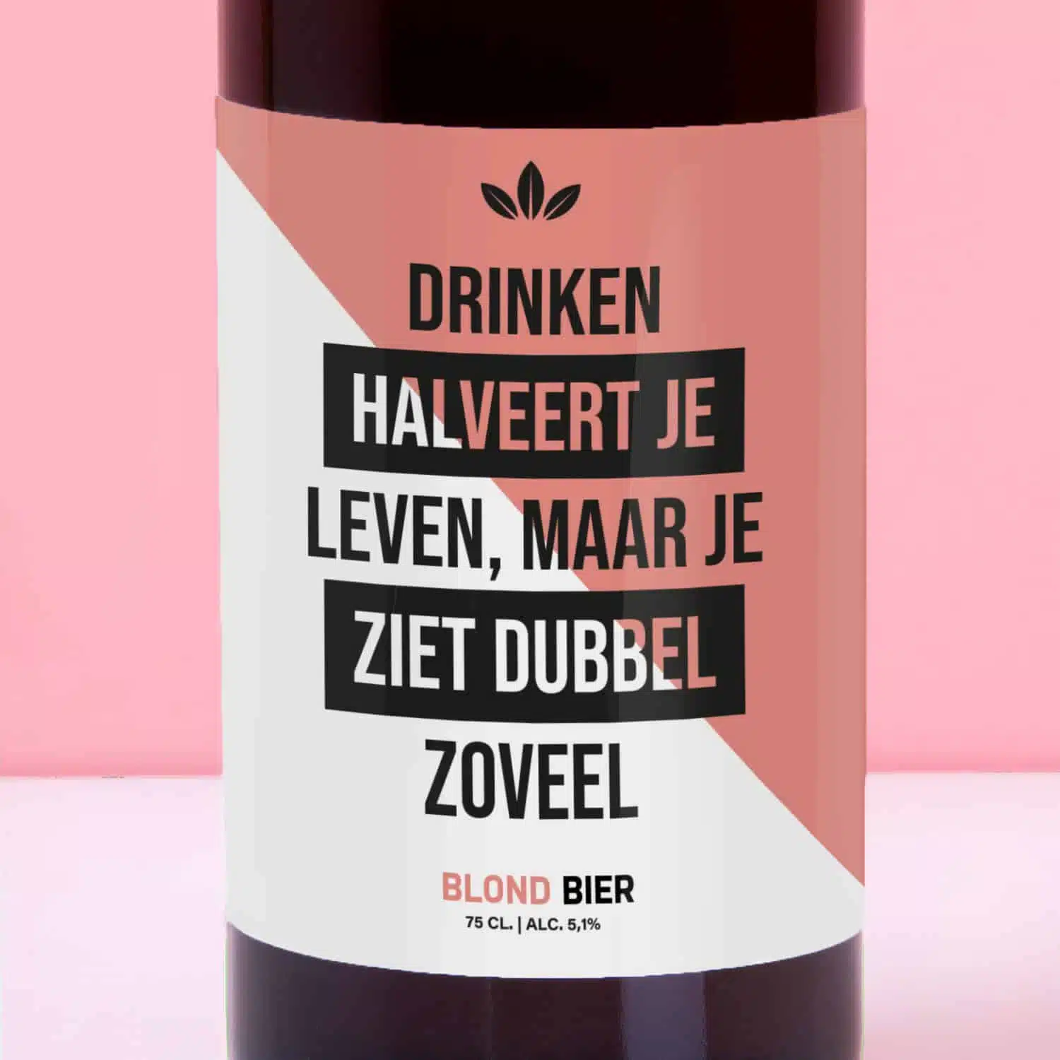 Drinken halveert je leven, maar je ziet dubbel zoveel: dat is het motto van de Bierfles Drinken halveert je leven. Een overheelijk blond Belgisch bier, met een grappig etiket met die tekst erop. Hierdoor is het perfect geschikt als cadeautje voor mensen die net als jij graag een biertje drinken. Ook leuk om cadeau te geven voor bijvoorbeeld Vaderdag of een verjaardag.