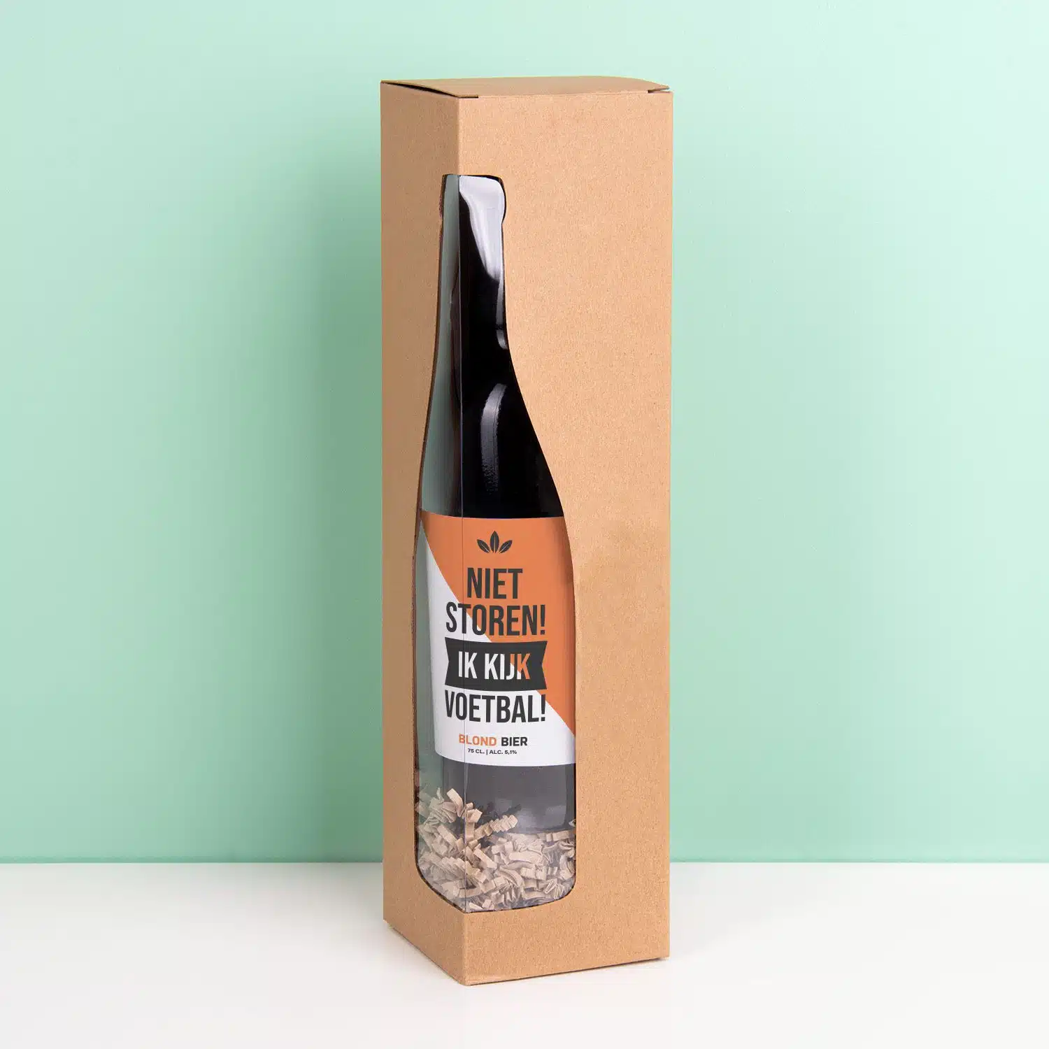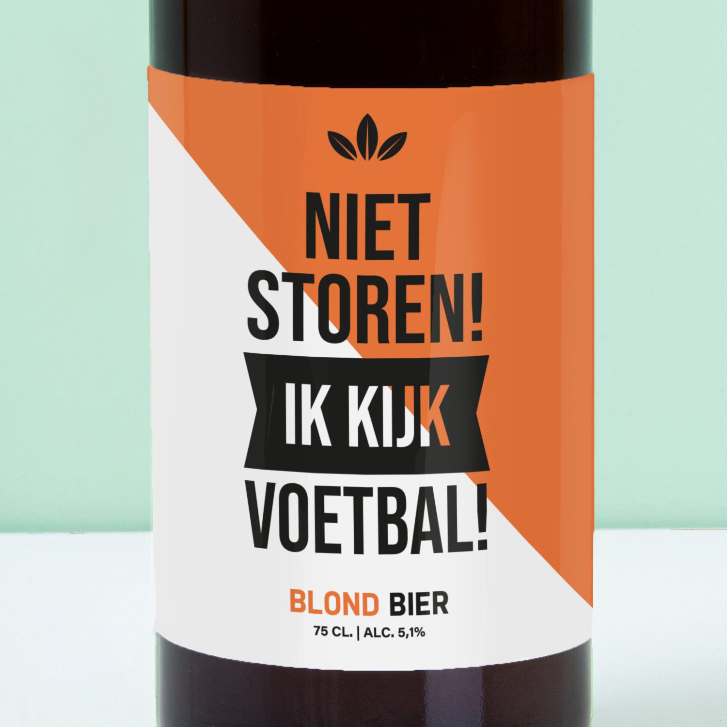 Wil je tijdens het voetbal niet steeds opstaan om een nieuw biertje te pakken? Met de Bierfles Niet storen ik kijk voetbal (750 ml) hoeft dat ook niet. Deze grote fles bier bevat genoeg Belgisch blond bier om in elk geval één helft door te komen. Op het etiket staat de tekst: Niet storen! Ik kijk voetbal! Hierdoor is het duidelijk voor iedereen: ze moeten jou voorlopig even met rust laten.