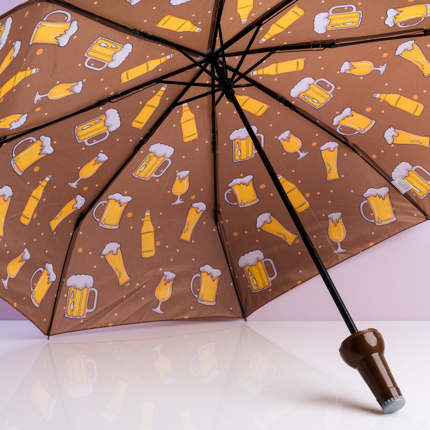 Bier is jouw favoriete drankje en iedereen mag het weten. Op regenachtige dagen draag jij daarom met trots de Bierfles paraplu van Out of the Blue. Deze unieke paraplu ziet er in de koker uit als een flesje bier. De hals van de fles bier is het handvat van de paraplu. Op de bruine paraplu zelf staan allerlei glazen en flessen bier.