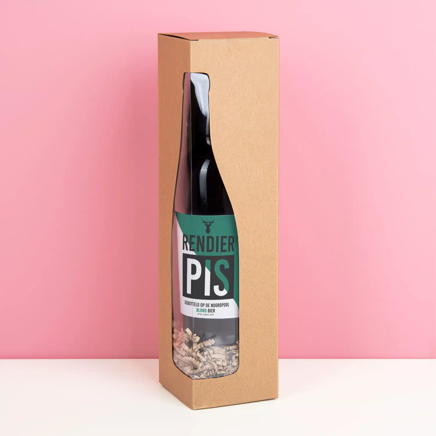 - Heeft een etiket met de tekst: Rendier pis. Gebotteld op de Noordpool.