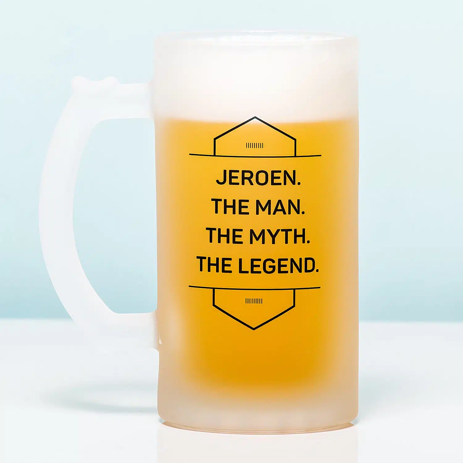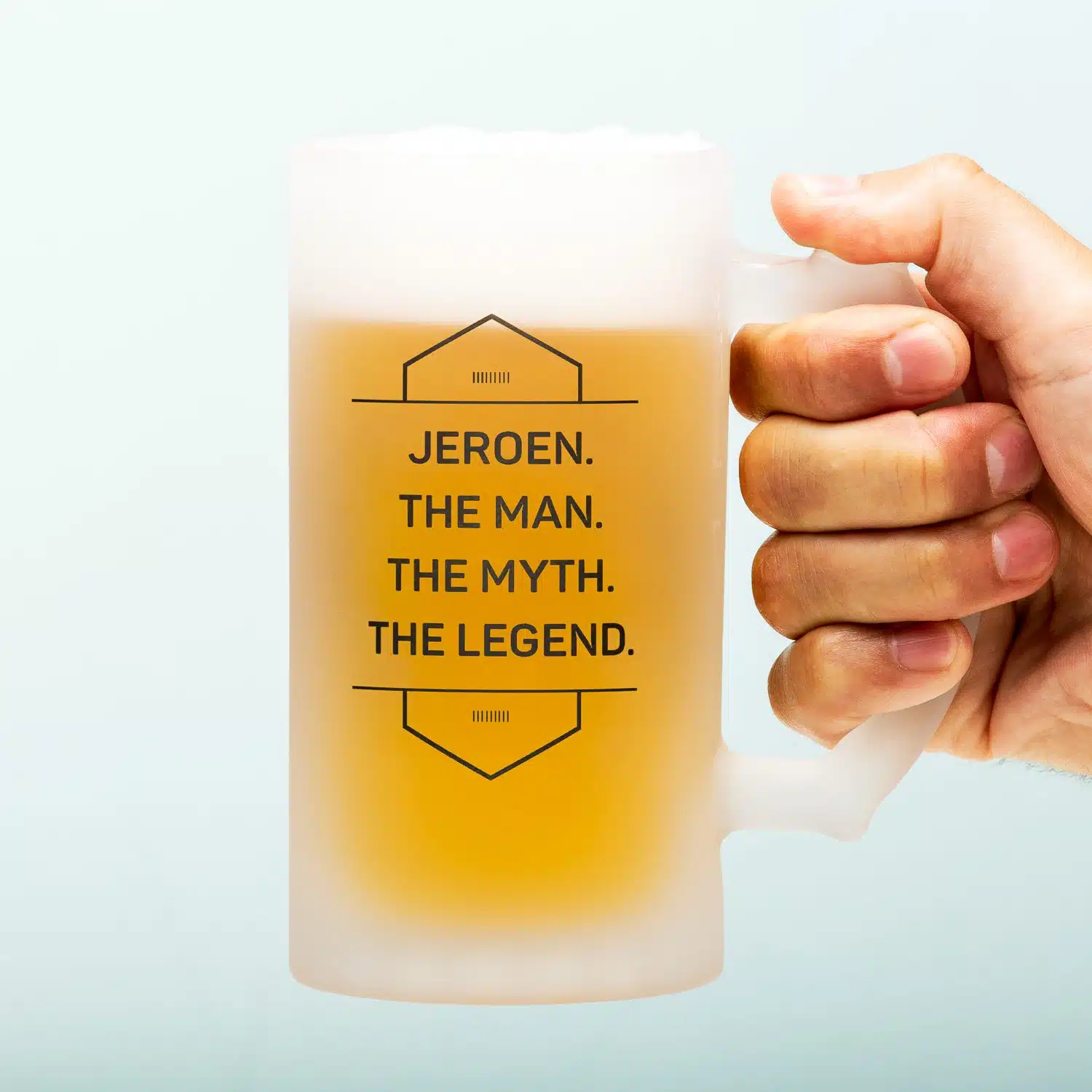 Van gepassioneerde bierdrinkers tot Oktoberfest bezoekers: ze worden allemaal blij van de Gepersonaliseerde bierpul The Man The Myth The Legend. Deze unieke bierpul wordt voorzien van de naam van de ontvanger. Zo geef je een uniek en persoonlijk kado, bijvoorbeeld voor je pa als Vaderdag cadeau of voor je vriend als verjaardagscadeau. Onder de naam staat de tekst: The Man. The Myth. The Legend. Wie is zo’n bierheld dat hij deze bierpul verdiend?