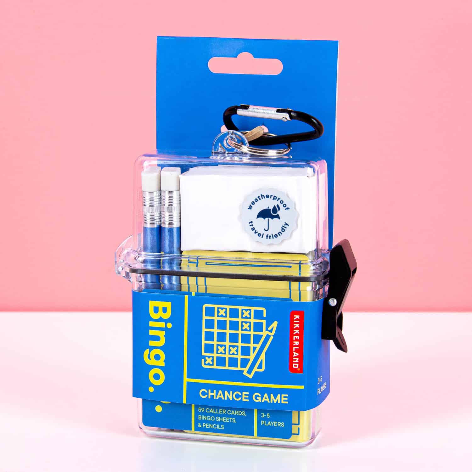 Of je nou in de auto zit, op de camping of in de wachtrij voor een veel te dure pretpark-snack: met Bingo voor onderweg van Kikkerland maak je overal een feestje van. Geen lompe molen met balletjes, maar handige nummerkaartjes die je trekt. Iedereen krijgt zijn eigen bingokaartje en potlood om de nummers af te strepen. En als je een valse bingo roept, dan weet je het: je moet een liedje zingen. Het hele spel zit verpakt in een compact doosje met karabijnhaak, zodat je ‘m zo aan je tas klikt. Laat die roadtrip maar komen!