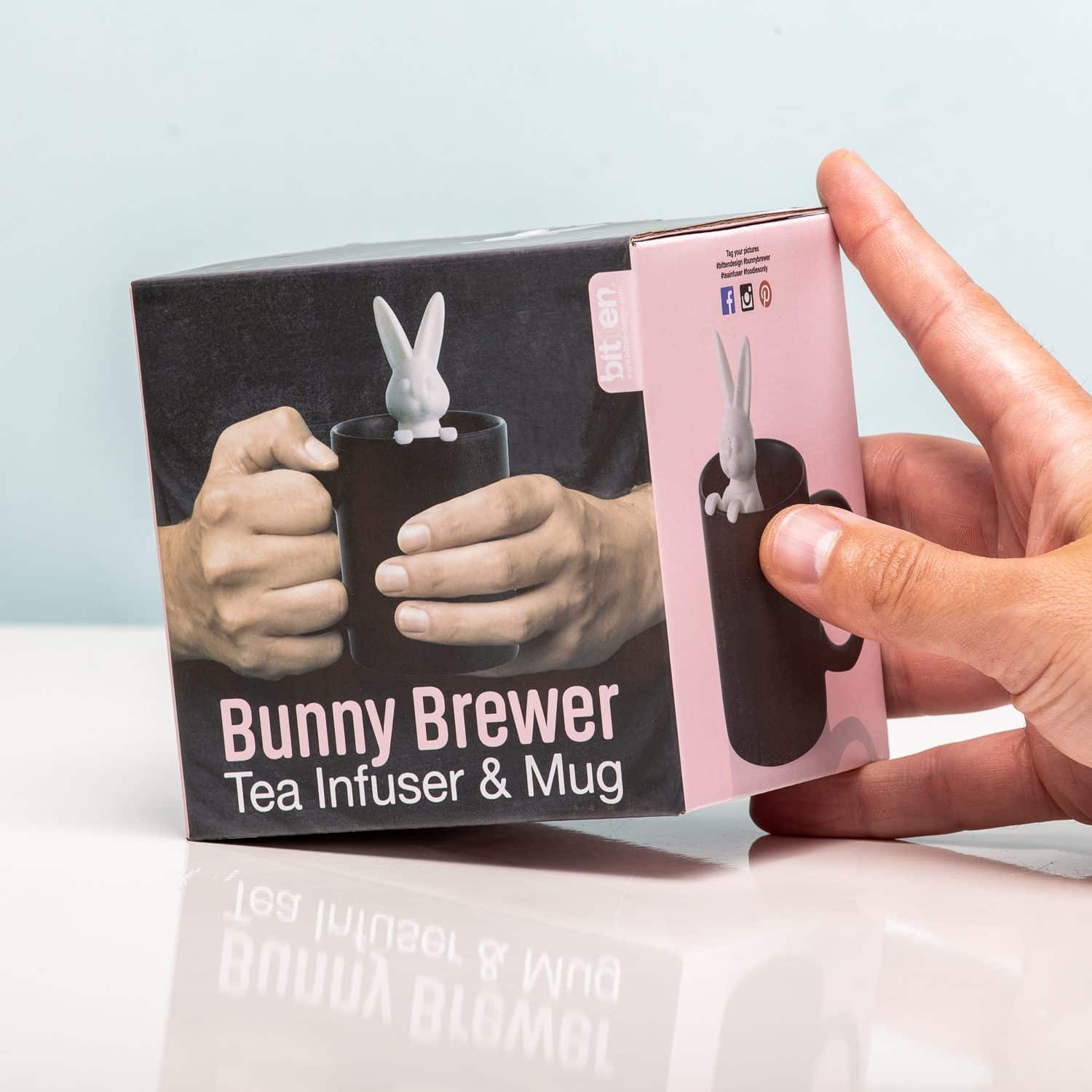 Konijnen uit je hoge hoed toveren, is iets wat je graag doet. Jij komt altijd met een verrassend idee aanzetten. Soms vragen mensen zich af hoe jij toch op zulke leuke, spontane ideeën komt. Heel simpel: die verzin jij tijdens het drinken van een kopje thee. En dan wel op een speciale manier gezet: met deze Konijn beker en tea infuser van Bitten. Je vult het witte konijn met je favoriete smaak losse thee om ‘m vervolgens over de rand van de zwarte mok te hangen. Wanneer de theebladeren het hete water op smaak hebben gebracht, tover jij het konijn uit de hoed, eh, mok.