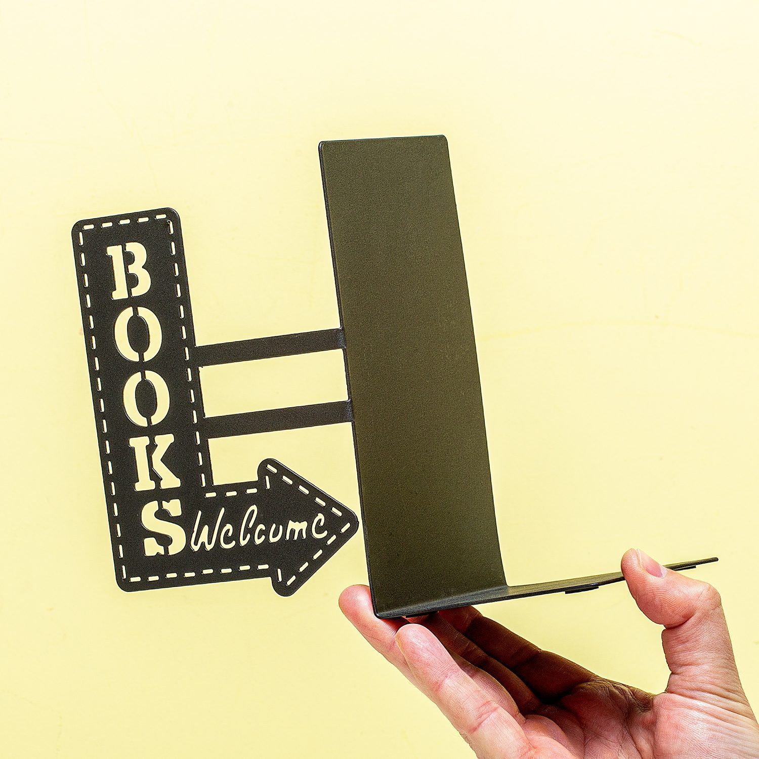 • In de vorm van een pijl, met de woorden books en welcome