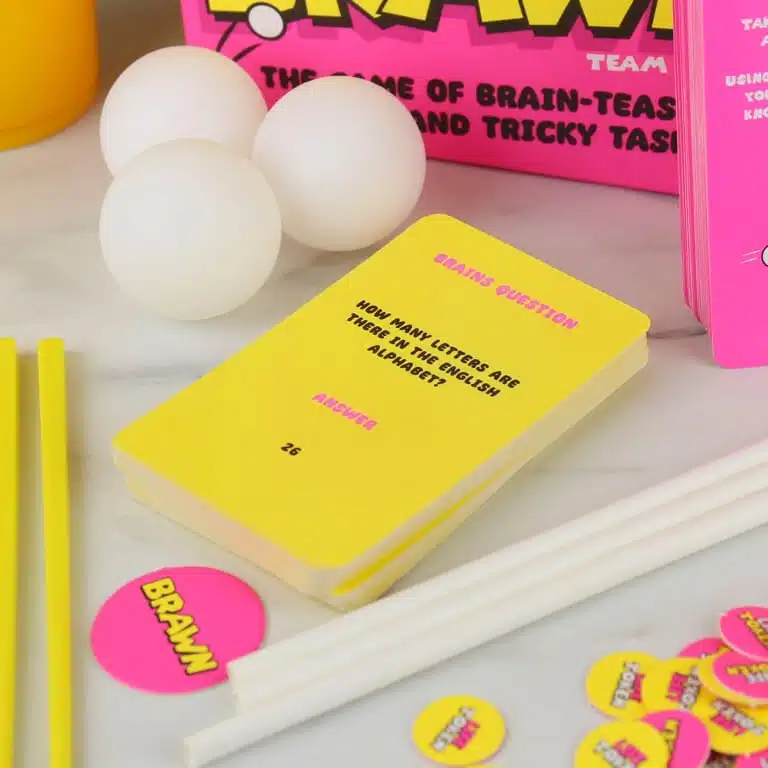 Het Brains vs Brawn spel van Gift Republic is het ultieme partyspel waarbij hersenen en behendigheid tegen elkaar strijden. Beantwoord lastige kennisvragen of voer gekke fysieke uitdagingen uit. Wie wint: de slimmeriken of de sportievelingen? Dit spel bevat kaarten met vragen en uitdagingen, dobbelstenen en alles wat je nodig hebt voor een hilarische spelletjesavond.