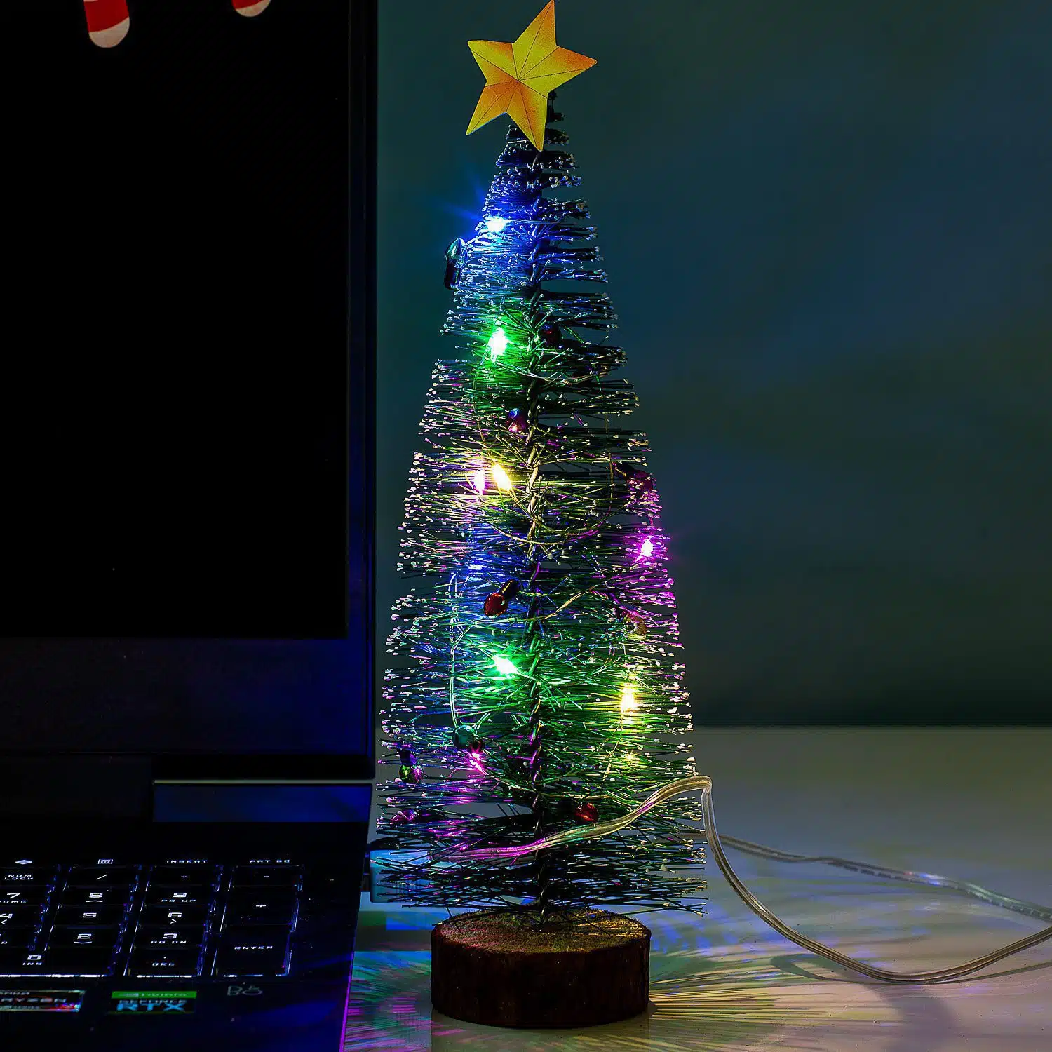 - Inhoud: miniatuur kerstboom met echte lichtjes, mini-kerstsok, papieren kerstster en een candy cane slinger