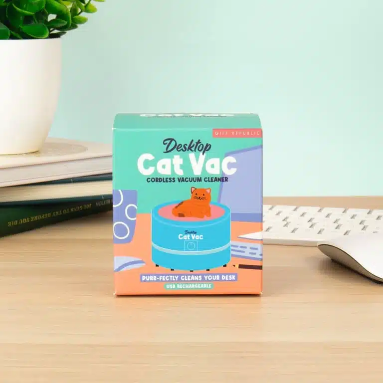 Kruimels op je toetsenbord? Stof tussen je papieren? De Bureaustofzuiger met kat van Gift Republic is jouw nieuwe beste vriend op kantoor! Deze draadloze mini stofzuiger in kattenvorm zuigt alles op wat je bureau vervuilt, van broodkruimels tot poedersuiker van je elfde donut. Met zijn schattige kattendesign brengt hij een glimlach op elk gezicht. Perfect cadeau voor je collega die altijd aan het snacken is achter de laptop of gewoon voor jezelf omdat hij té schattig is om niet te kopen!