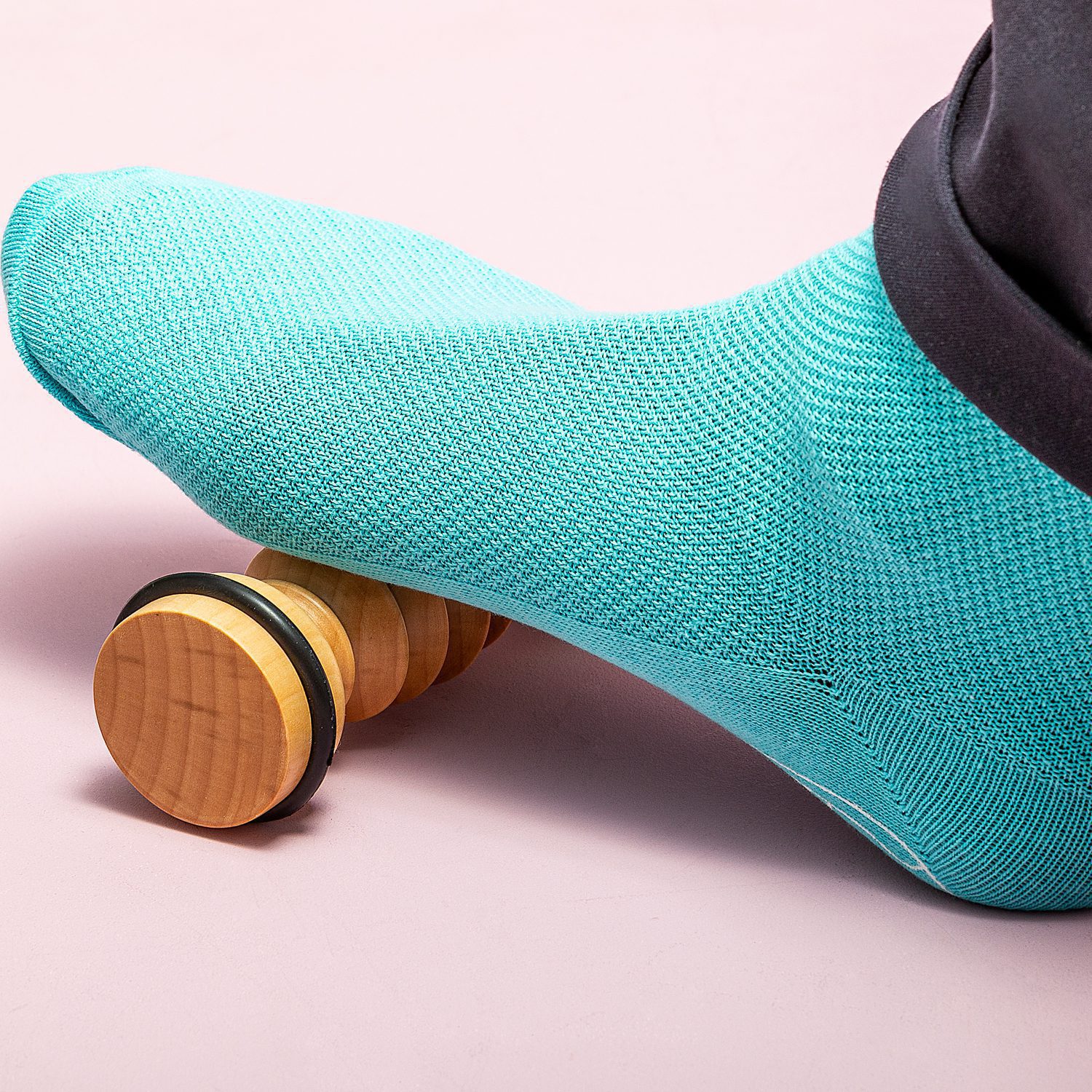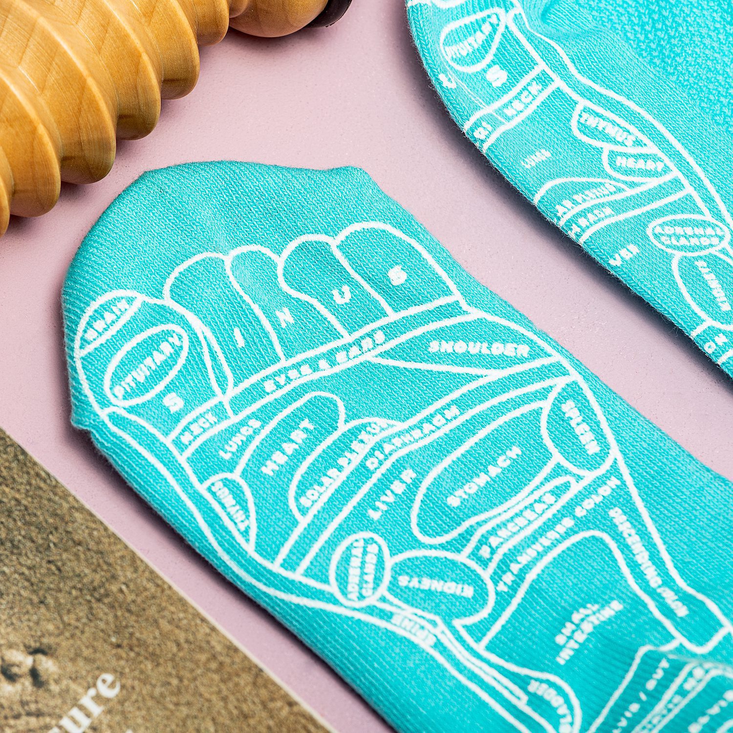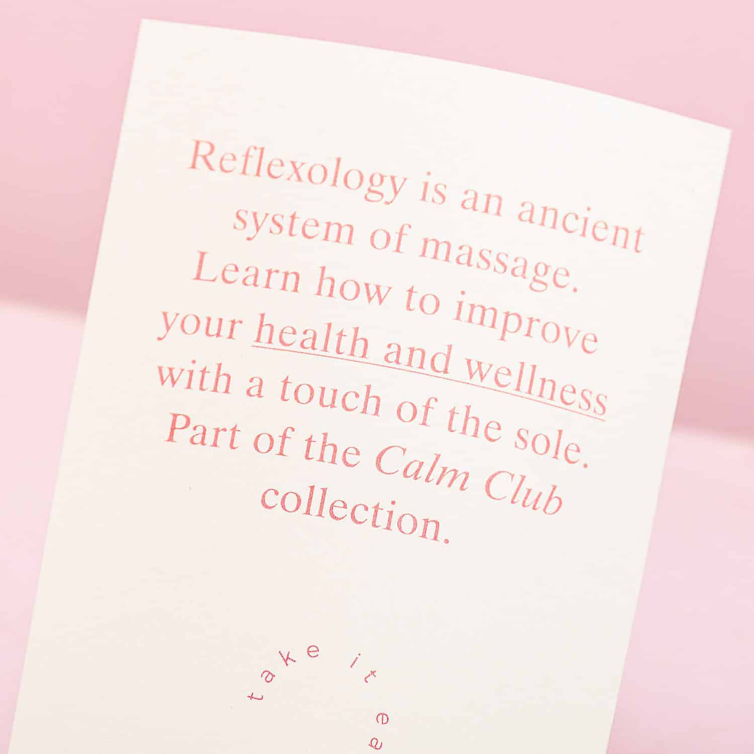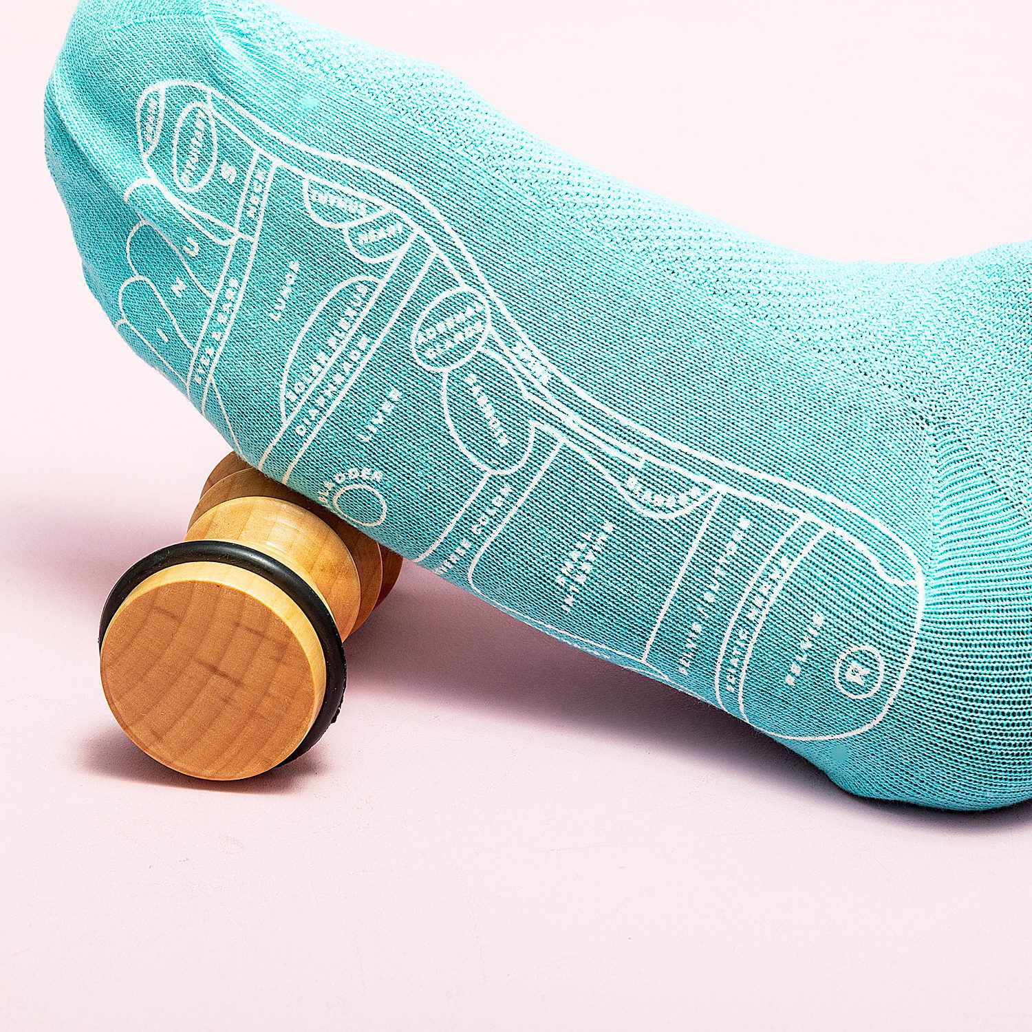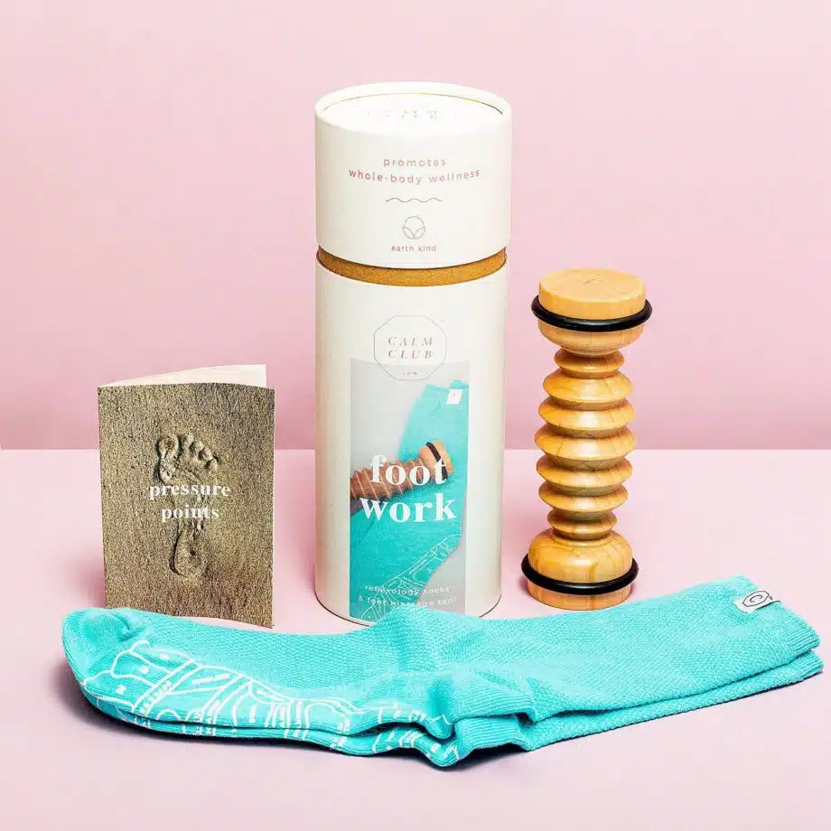 Door de drukpunten op je voeten te masseren kun je bepaalde lichaamsdelen beïnvloeden. Met de Calm Club voetroller van Luckies krijgt je een complete set voor voetreflexologie. In de set zit een instructieboekje, sokken en een houten voetroller. Op de sokken staat waar welke drukpunten zitten.
