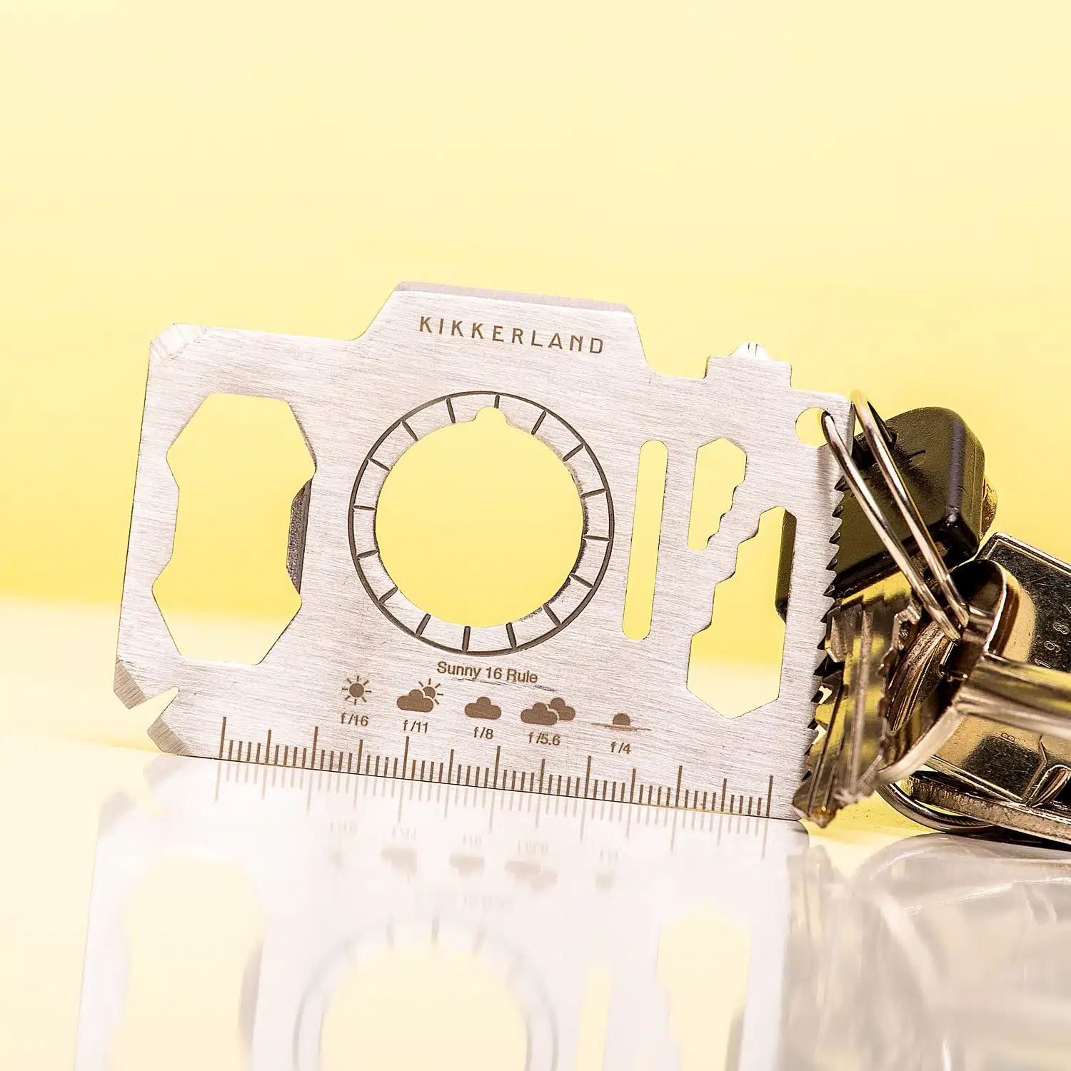 De sleutel tot succesvol kamperen is niet te veel meenemen, maar toch alle belangrijke benodigdheden bij de hand hebben. De Camera creditcard multitool van Kikkerland is hierbij een handig hulpmiddel. Deze leuke multitool – in de vorm van een camera – heeft maar liefst dertien functies. Zo is hij voorzien van een zaagje, mesje, liniaal, verschillende moersleutels en schroevendraaiers en natuurlijk een flesopener. Door het handige formaat past deze multitool in je portemonnee, maar je kunt hem ook aan je sleutelbos hangen.