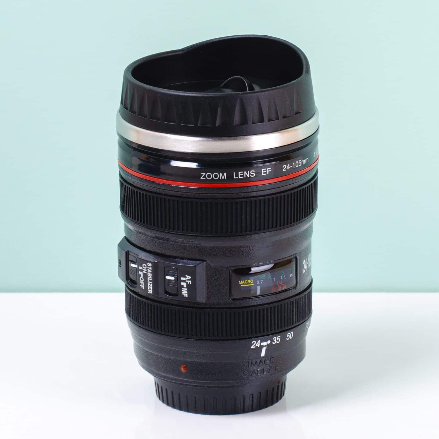 Voortaan drink jij je koffie met stralende glimlach. Je weet namelijk maar nooit wanneer je op de foto wordt gezet. De Cameralens mok is de leukste beker voor modellen en fotografen. Deze beker ziet eruit als een EF24-105 millimeter lens. Foto’s maken doet ‘ie niet, maar hij is prima geschikt om koffie en thee uit te drinken. Heb je een vriend die dol is op fotograferen en zoek je nog een leuk verjaardagscadeau voor hem? Geef hem de cameralens beker cadeau! De beker heeft een deksel met schroefdop.