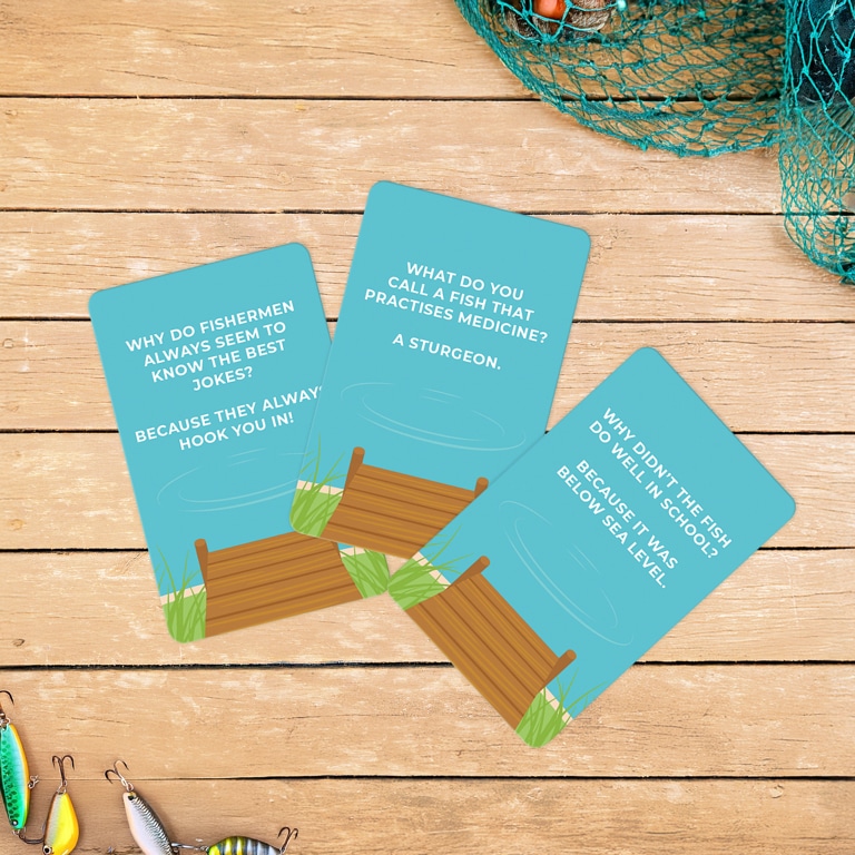 Get ready to scale new depths! De Dad Jokes viseditie van Gift Republic is een set van 100 kaartjes met de slechtste visgrapjes die je ooit hebt gehoord. Van “reel good” woordgrappen tot one-liners waarvan je ogen automatisch gaan rollen: deze grappen zijn zo slecht dat ze weer goed zijn. Perfect voor bij de visvijver, tijdens de BBQ of gewoon op de wc. Een hilarisch cadeau voor vissende vaders en woordgrappenfanaten!