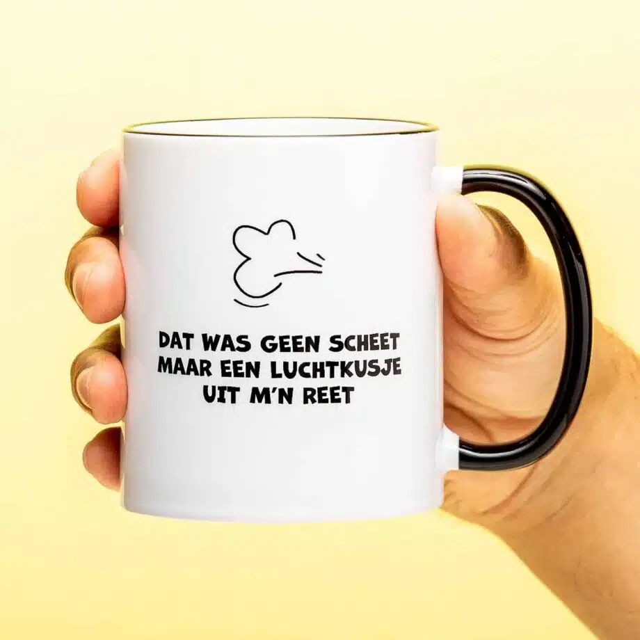 We hebben er allemaal wel mee te maken: zo’n huisgenoot of collega die om de haverklap zeurt over de scheten die je laat. Maar het is allemaal niet zo dramatisch, toch? Jouw scheten ruiken heerlijk en ze zouden zich juist vereerd moeten voelen. Dat blijkt wel, als je de tekst op de Dat was geen scheet mok leest. Daar staat namelijk op: Dat was geen scheet, maar een luchtkusje uit m’n reet.