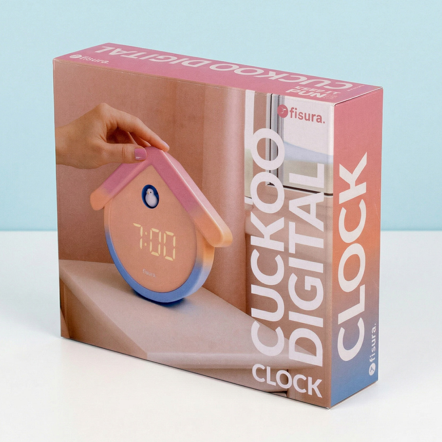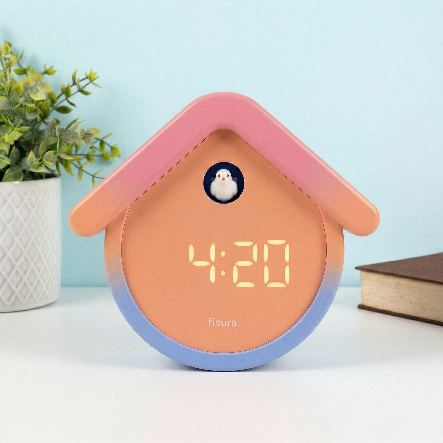 De Digitale wekker met koekoek van Fisura is de moderne versie van de klassieke koekoeksklok: een vrolijk vogelhuisje in blauw, oranje en roze die in elkaar overlopen, met een schattig wit vogeltje. Digitaal display, geen ingewikkeld mechanisme en wél die gezellige koekoeksklok-energie. Een blikvanger op je nachtkastje of bureau.