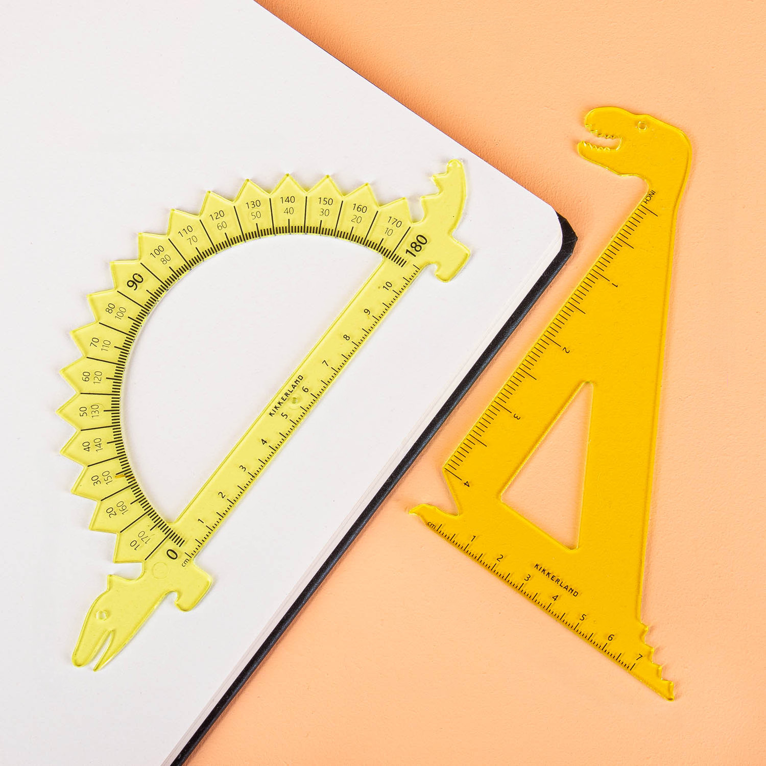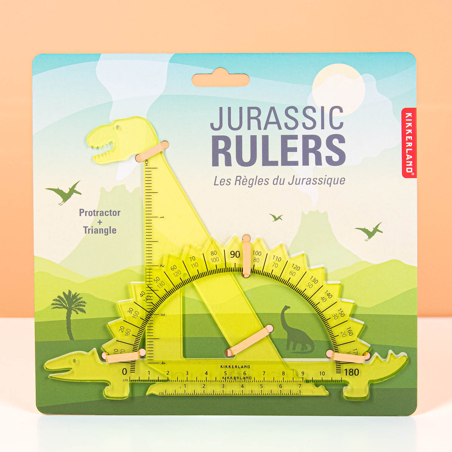 De Dino linialen (set van 2) van Kikkerland zijn er voor iedereen die van dinosaurussen houdt én van tekenen. Deze set bevat een geodriehoek en een gradenboog, beide met een stoer dino-ontwerp. Perfect voor op school, huiswerk of gewoon voor creatieve projecten thuis. Schets, meet en brúl als een dinosaurus! Leuk cadeau voor jonge dino-fans en aankomende architecten.