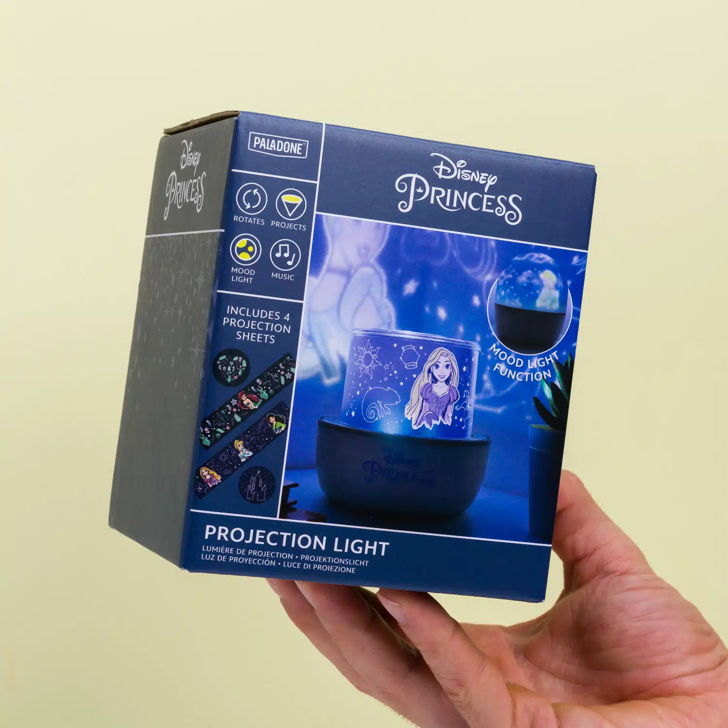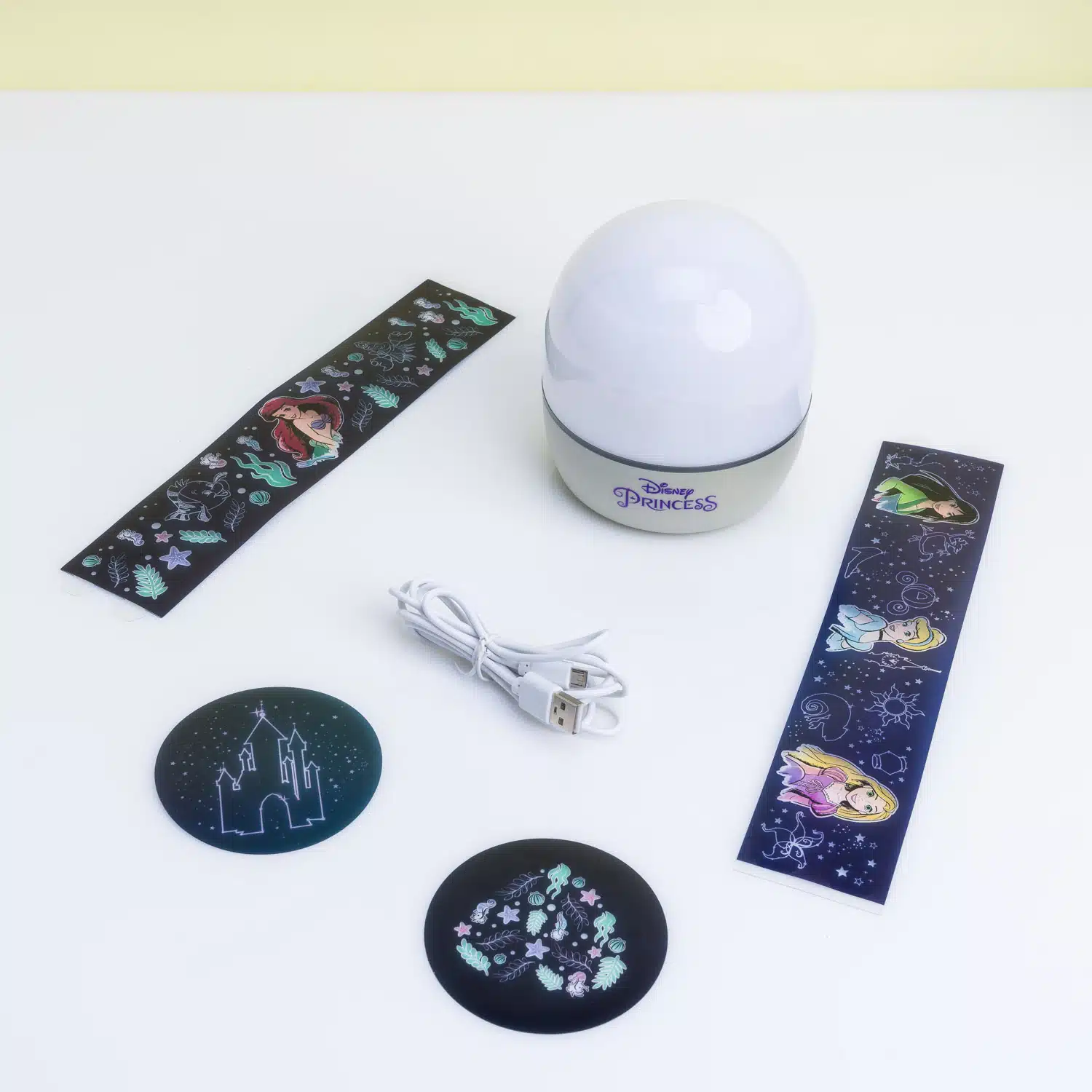 Princess projectielamp van Disney. Een lamp die je favoriete Disney prinsessen op de muur kan projecteren. De lamp maakt een sterrennacht of onderwaterwereld, maar kan ook Ariël of Assepoester op de muur vertonen. Komt met vier verschillende projectiebladen.
