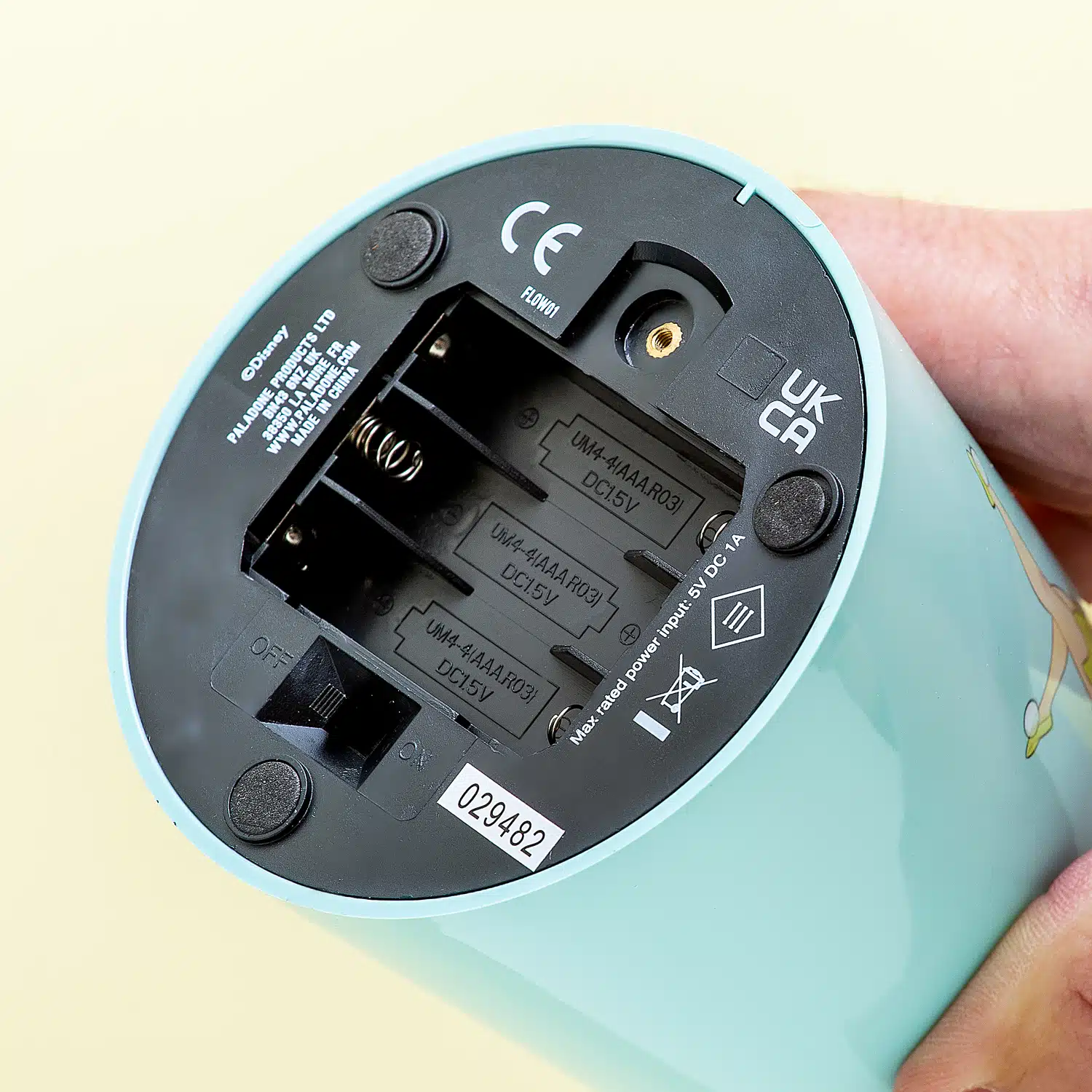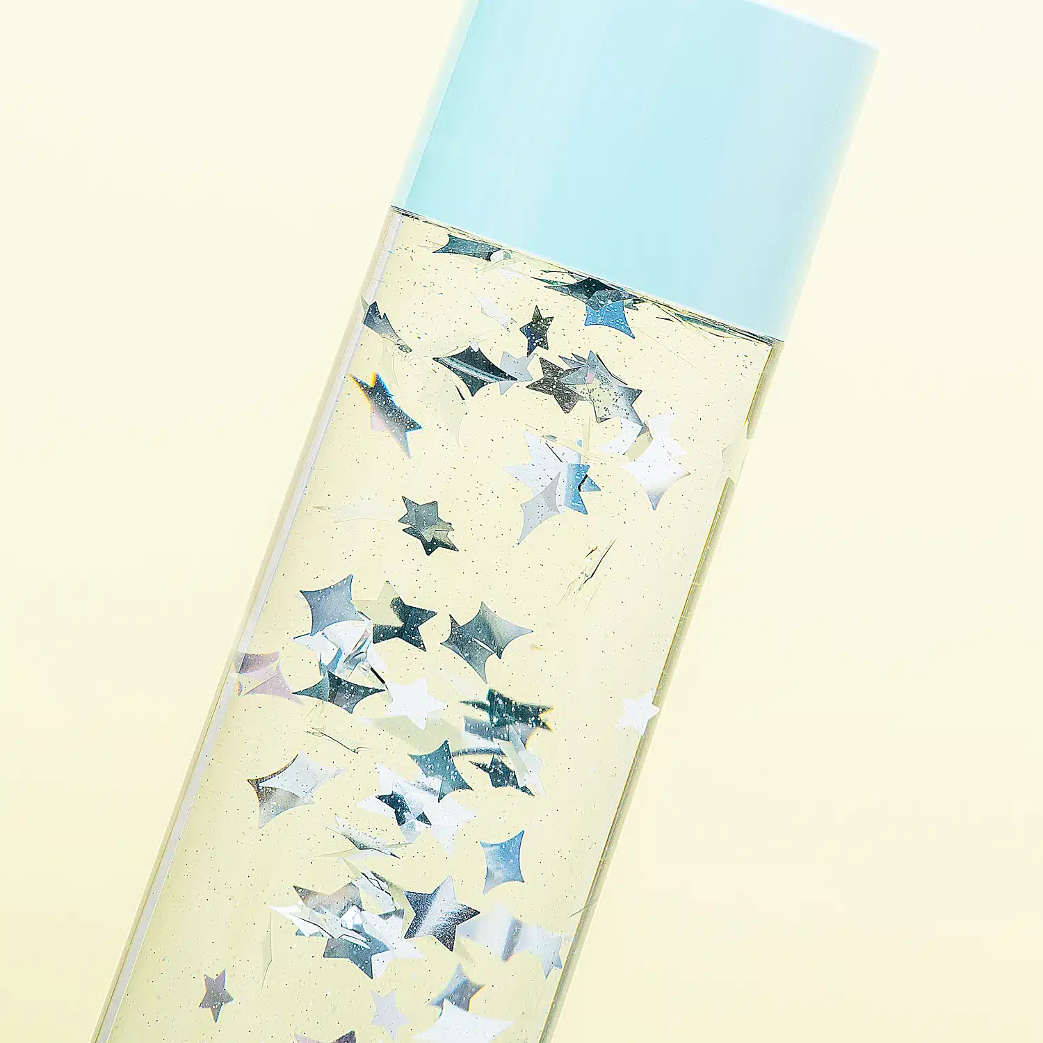Lavalamp in Tinker Bell thema. Op de mintgroene basis staat Tinker Bell. Zet je de lamp aan, dan geeft hij licht en beginnen de sterretjes van zilverfolie door de transparante vloeistof te zweven.