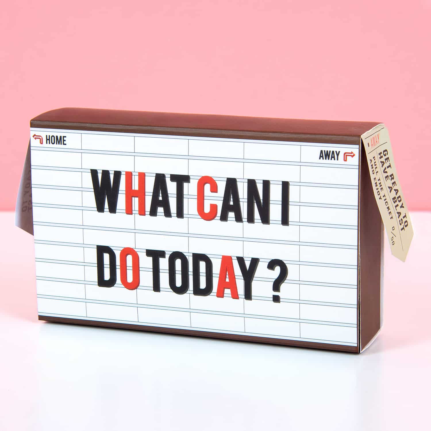 Niks is zo vervelend als een vrije dag hebben, maar niet weten wat je eigenlijk wilt gaan doen. Met de Inspiratiebox What Can I Do Today van DOIY hoef je je nooit te vervelen! Je trekt gewoon een kaartje uit de box en leest wat je gaat doen. De 100 Awesome Plans tickets zijn verdeeld in twee categorieën; home of away. Ze bevatten Engelse opdrachten. Is het rotweer en wil je lekker thuis blijven? Kies dan voor een home-ticket. Je kunt dan maar zo de opdracht krijgen om je eigen bordspel te maken. Wil je juist de hort op? Kies dan voor een ticket uit de away-categorie. In de inspiratiebox zitten in totaal 100 ideeën.