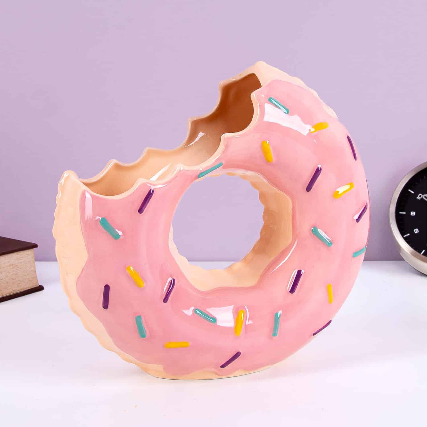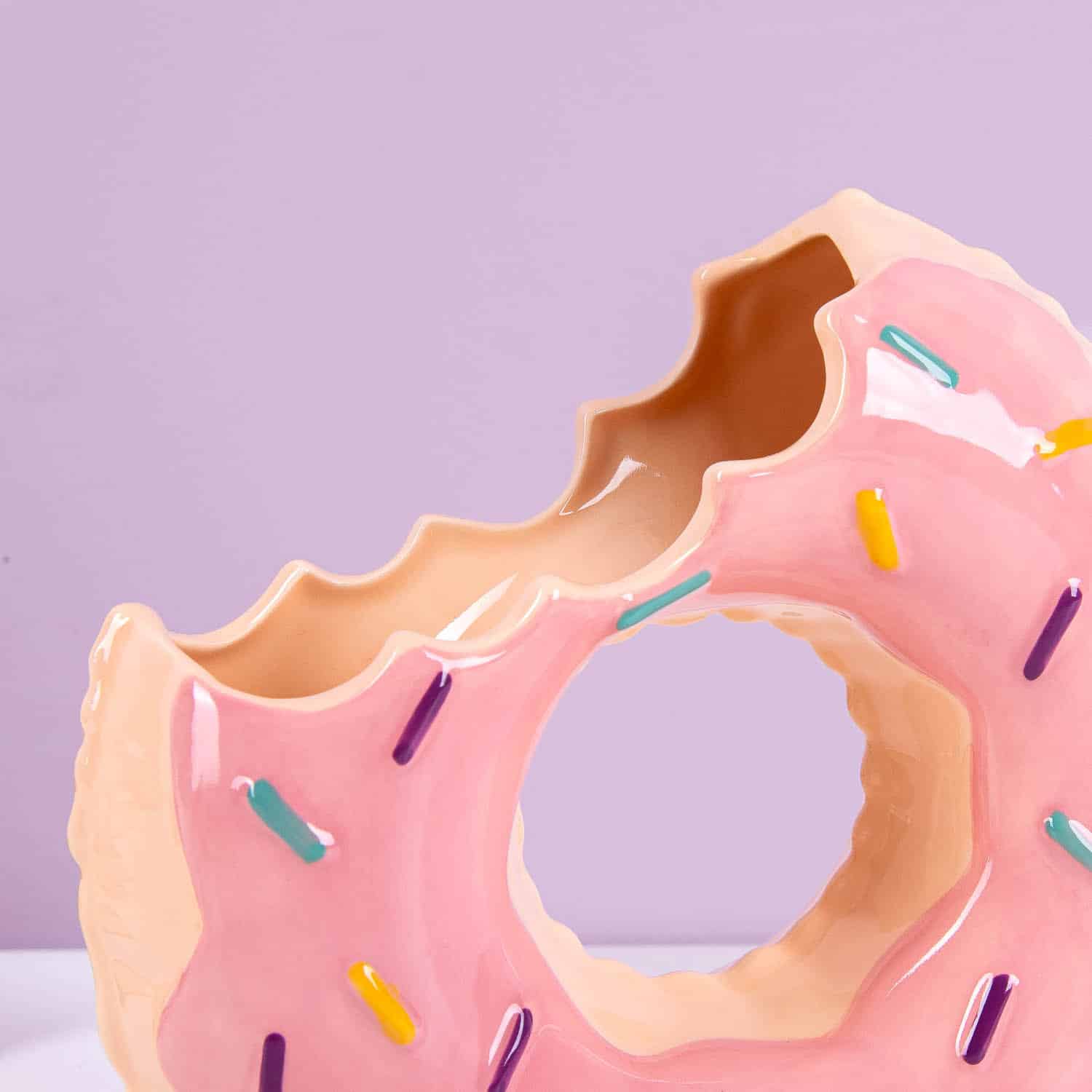 Waarom zou je een saaie vaas kopen, als je je bloemen ook in de Donut zwemband vaas van Bitten kunt zetten? Deze unieke vaas lijkt op de vorm van een donut zwemband, compleet met naden aan de zijkant. Maar dat is niet het enige bijzondere: iemand heeft er namelijk ook een paar happen uit genomen! Deze grappige vaas is het perfecte cadeautje voor Moederdag, kerst of een housewarming. Want zeg nou zelf: wie wordt er nou niet vrolijk van een vaas die lijkt op een donut?