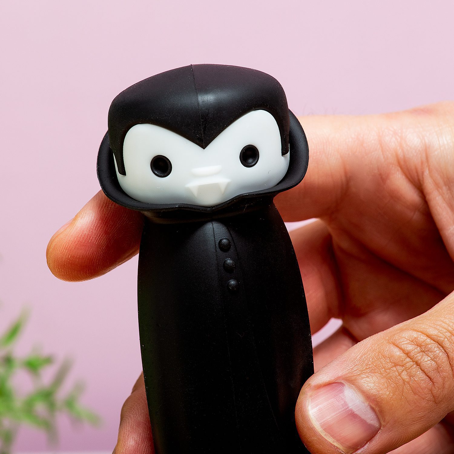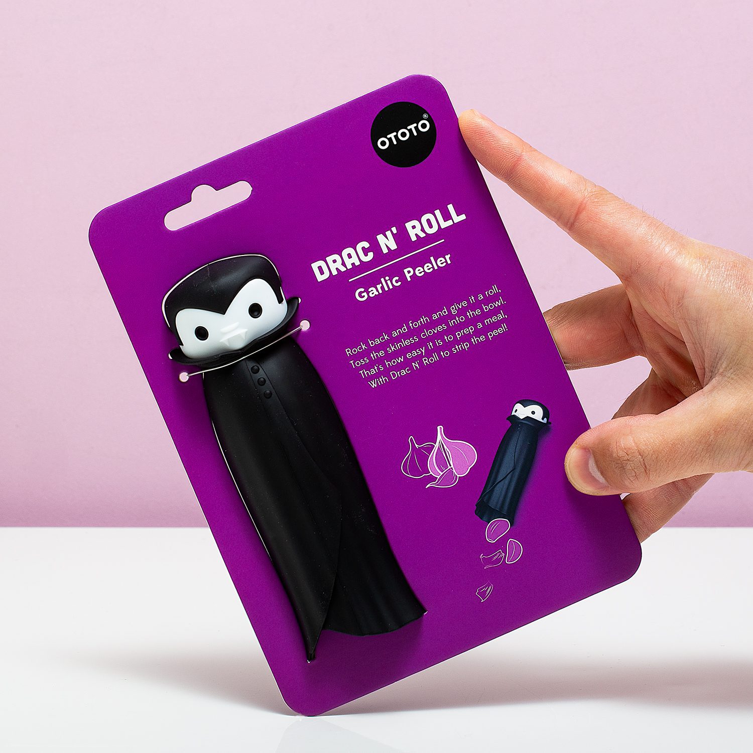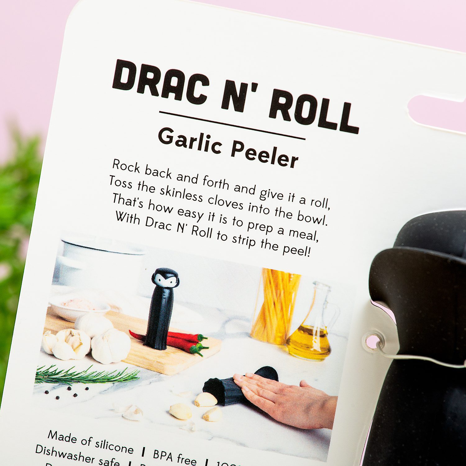 Knoflook is een heerlijke smaakmaker in gerechten. Alleen die geur die achterblijft op je handen na het pellen: juk! Met de Drac ‘n Roll knoflookpeller van Ototo pel je die pittige teentjes nu snel en effectief. De knoflookpeller is gemaakt van flexibele siliconen en ziet eruit als Dracula. Maar deze vampier kan wel tegen knoflook! Doe de teentjes in zijn jas en rol de peller vervolgens met je handen stevig heen en weer. Je hoort vanzelf hoe de schil loslaat van het teentje. Even ondersteboven houden en schudden, en de verse knoflook rolt poedeltjenaakt tevoorschijn.