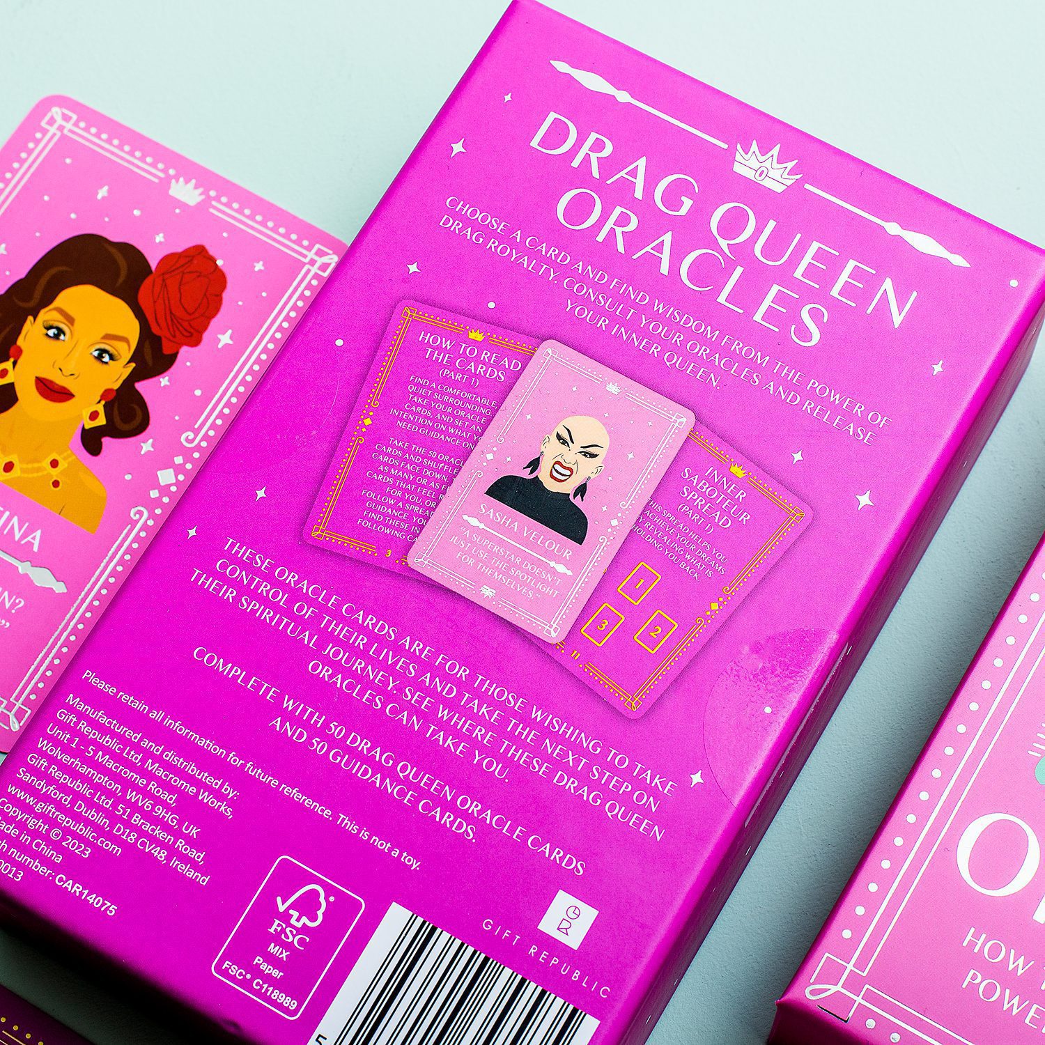 Ben jij klaar om te schijnen als de koningin die je bent? De Drag Queen orakel kaarten van Gift Republic helpen je hierbij! Je gebruikt deze kaartenset als een soort tarot kaarten: je stelt een vraag en trekt een kaart. De drag queen op de getrokken kaart geeft je vervolgens advies. Ben jij klaar om je innerlijke koningin te omarmen en vol zelfvertrouwen je leven te leven? In totaal bestaat de set uit 100 kaarten: de helft met je favoriete drag queens en vijftig kaarten met tips.