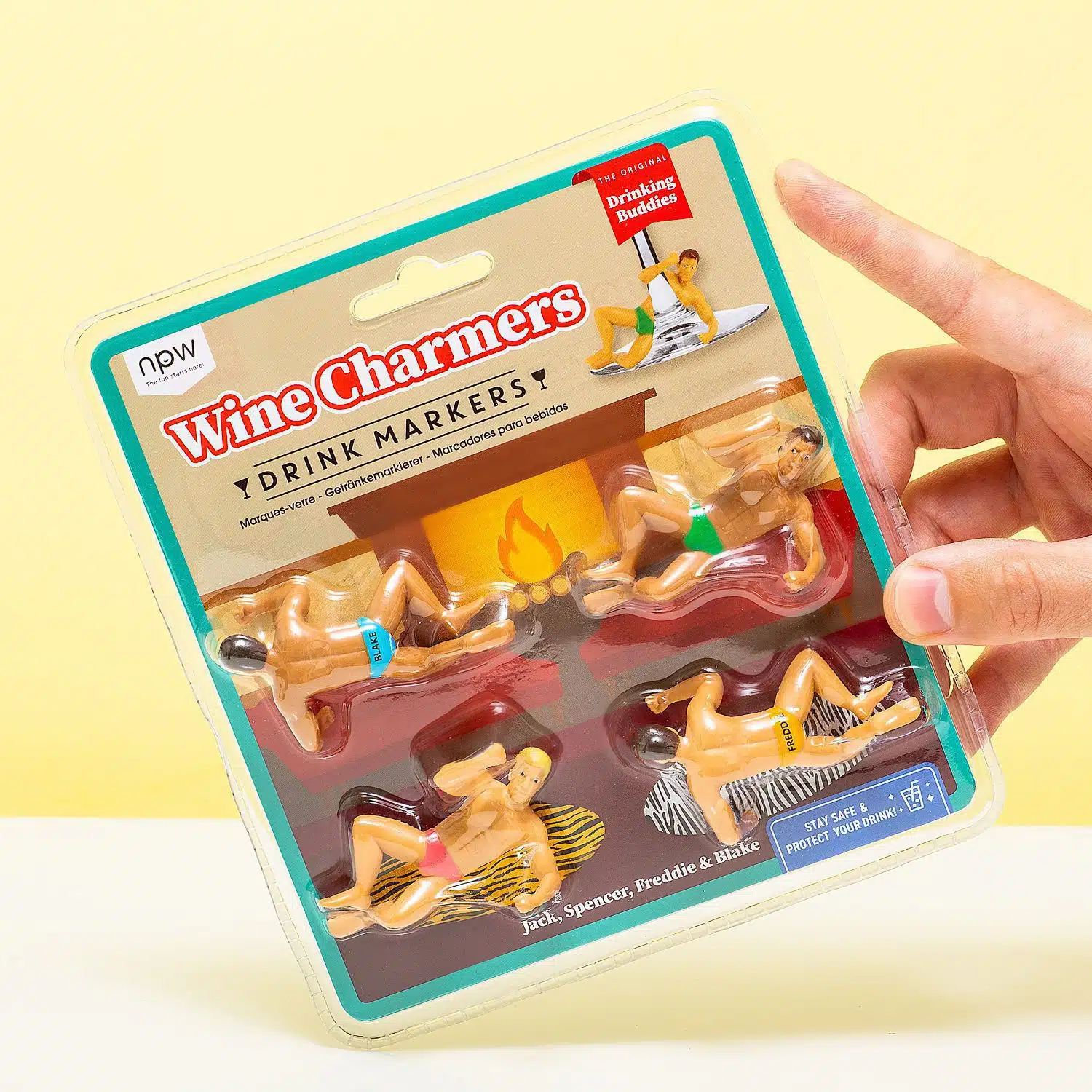 Wat is er beter dan een glas wijn? Een glas wijn én een hunk die aan je voeten ligt. Of nou ja, in het geval van de Drinking Buddies wijnmarkeerders (set van 4) van NPW London: een sexy vent die aan de voet van je wijnglas ligt. Deze vier grappige glasmarkeerders klem je om de stam van je glas. Ze hebben allemaal een andere kleur zwembroek, zodat je eenvoudig kunt onthouden welk glas van jou is.