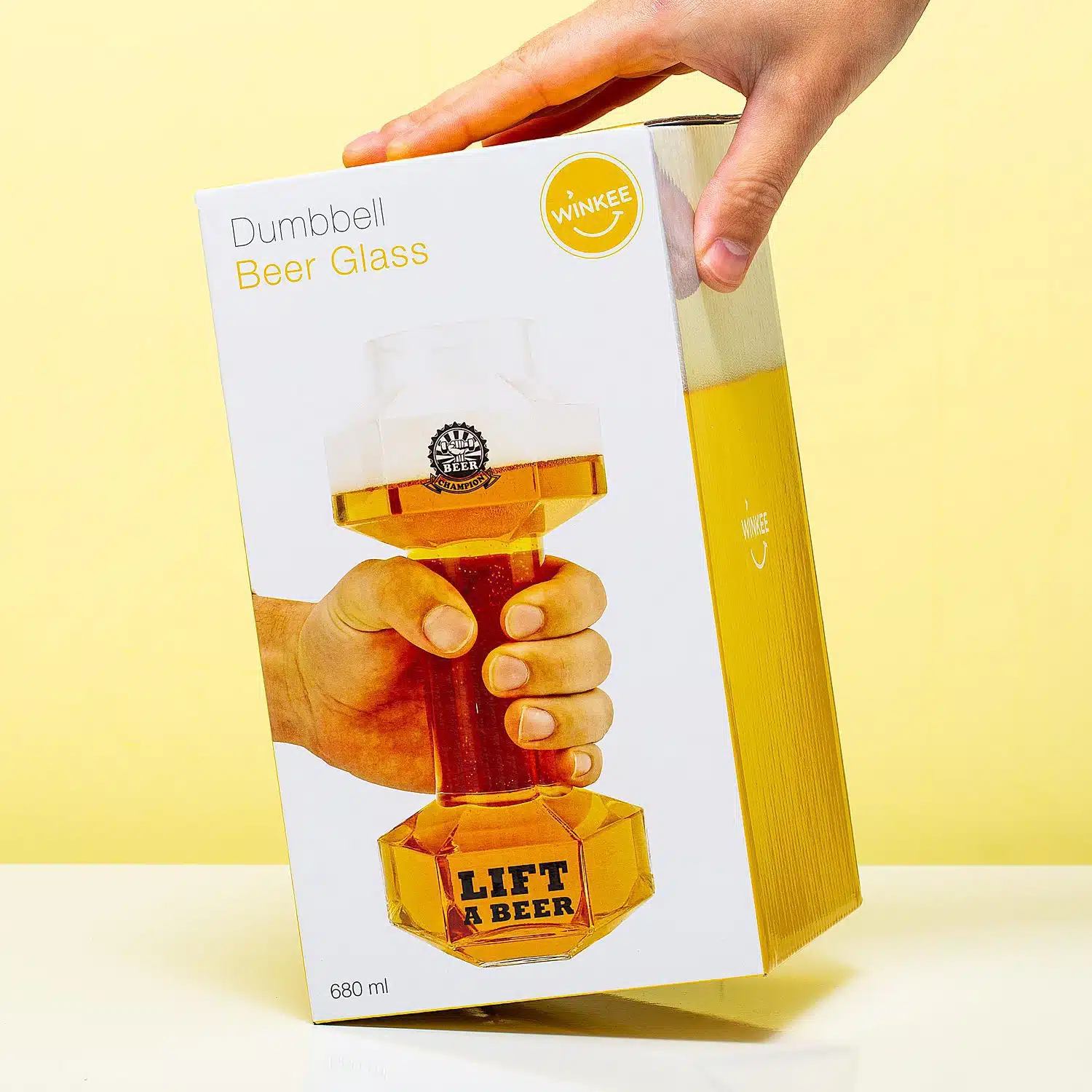 Mensen, we hebben de perfecte work-out gevonden: bier liften. En dat doe je door bier te drinken uit dit Dumbbell bierglas van Winkee. Vul dit bierglas in de vorm van een dumbbell, breng het naar je mond en je traint je biceps. Vergeet niet om het glas zowel met je linker- als rechterarm naar je mond te brengen, want één gespierde arm staat ook zo raar. Op het bierglas staat de tekst Lift a beer.