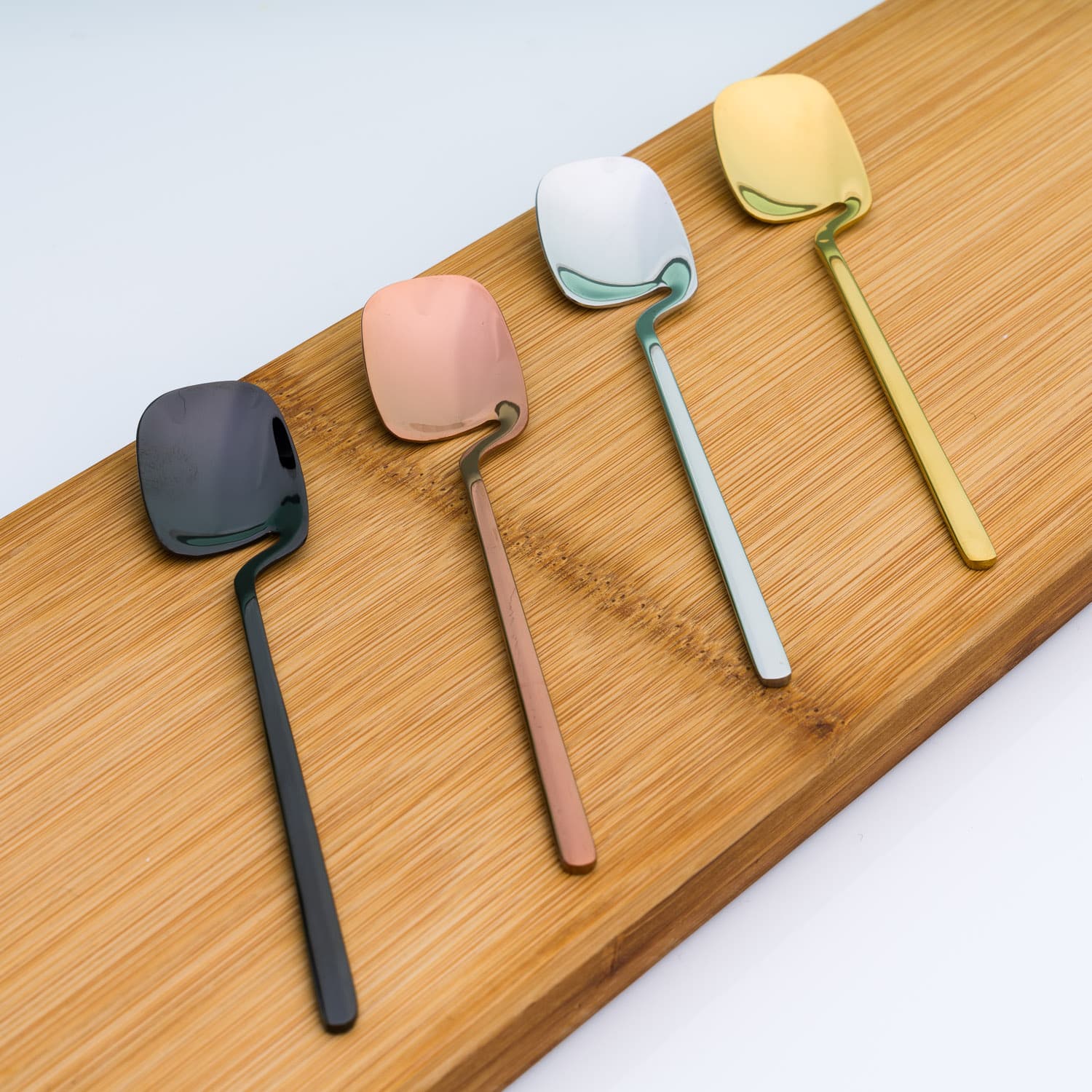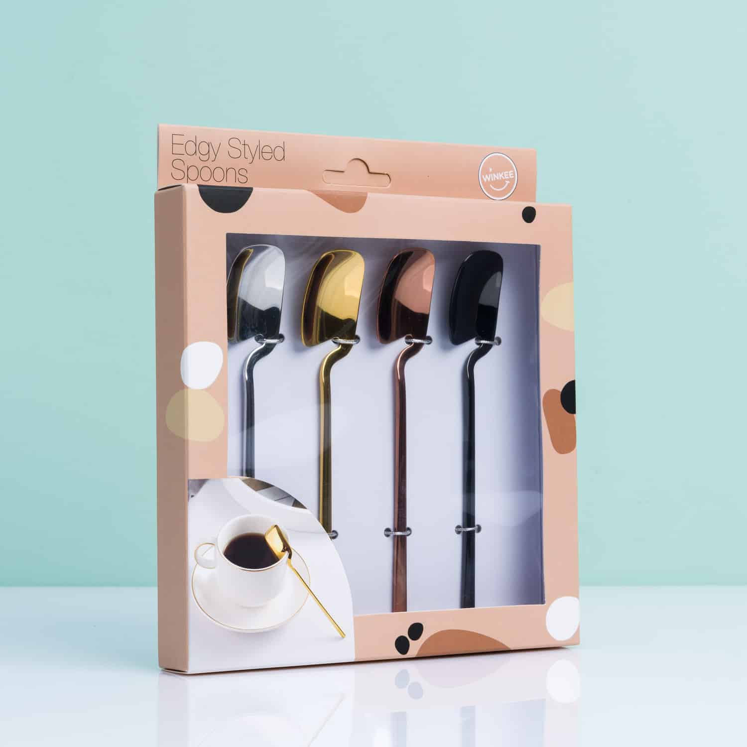 Edgy theelepels (set van 4) van Winkee. Een set van vier theelepels, die door hun speciale vorm aan de rand van je kopje blijven hangen. De Edgy theelepels zijn gemaakt van roestvrij staal en komen in vier kleuren: brons, goud, gunmetal en zilver.