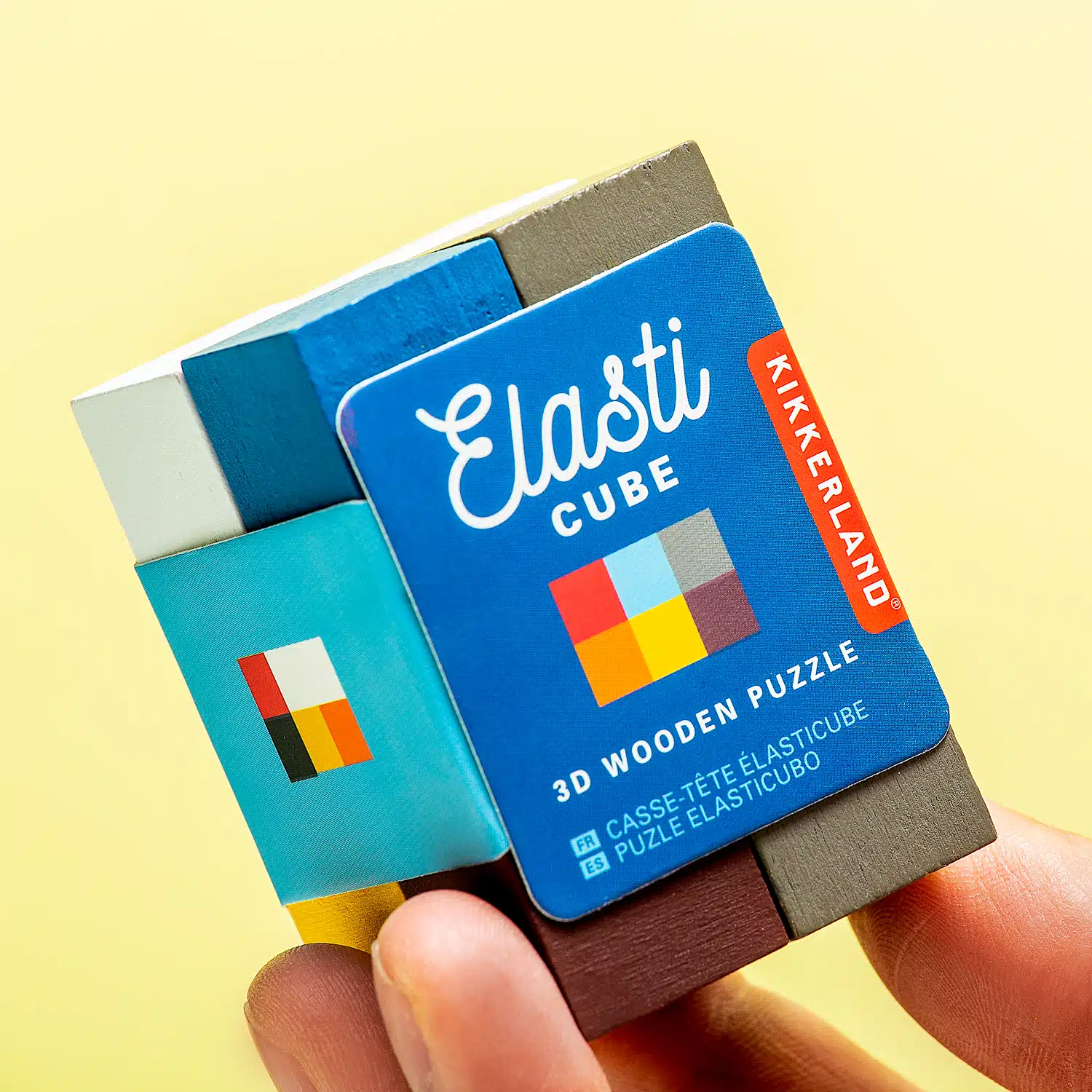Elastische houten puzzel van Kikkerland. Driedimensionale puzzel die bestaat uit twaalf houten blokken die met elkaar zijn verbonden met elastiek. Je kunt allerlei verschillende vormen maken met deze originele puzzel. Een fijne manier om te ontstressen. Ook leuk voor kinderen!