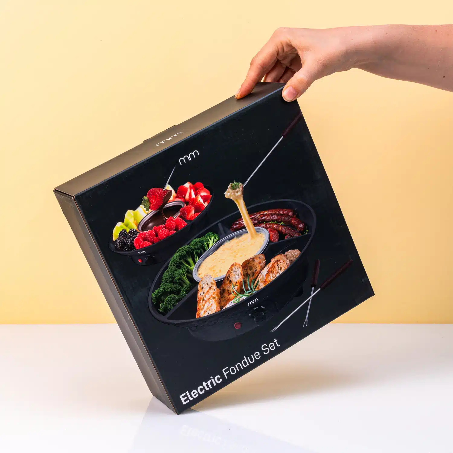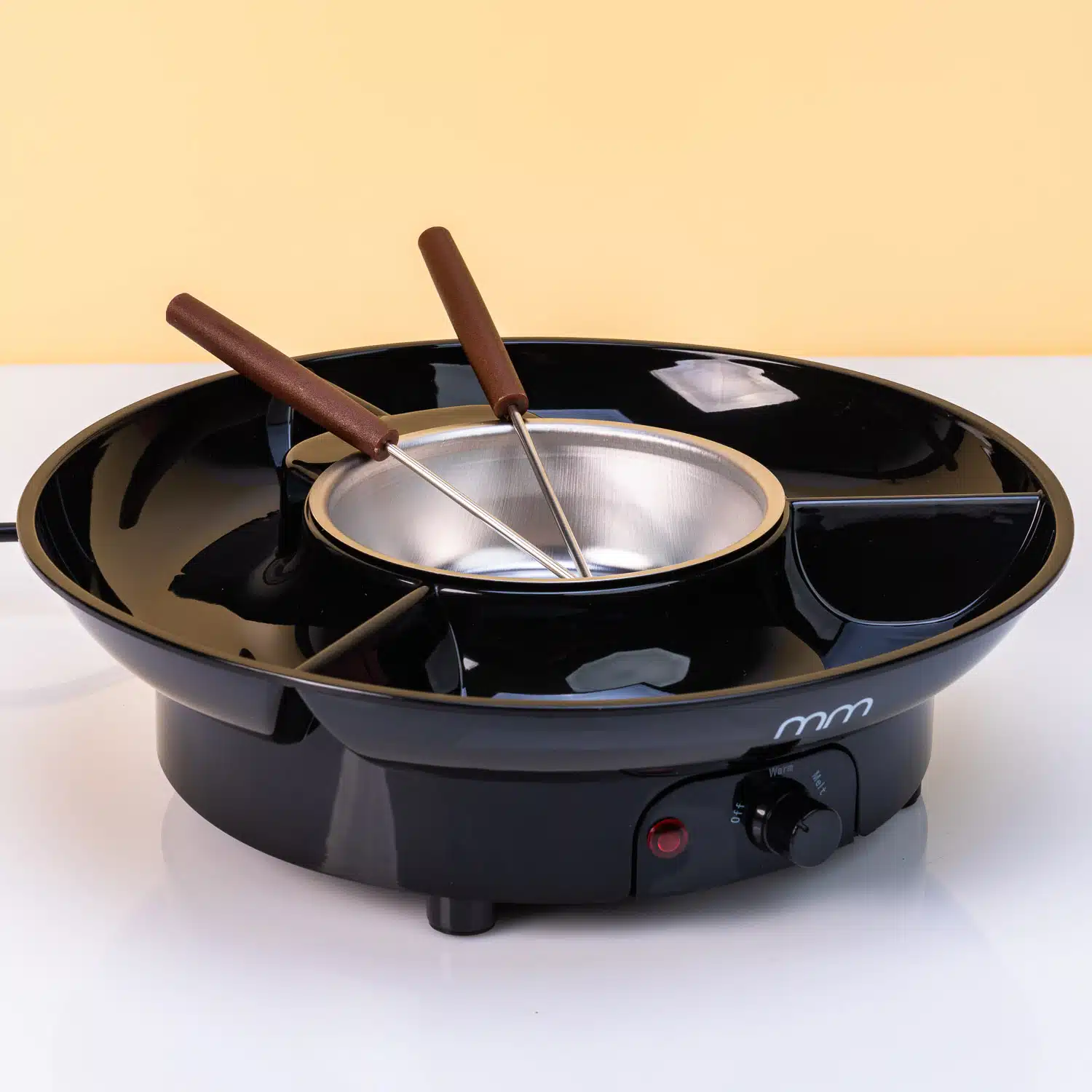 Elektrische fondueset van MikaMax. Fonduestel om te gebruiken voor een kaasfondue of chocoladefondue. De kaas of chocolade smelt je in het middelste bakje. In de drie vakken daar omheen is ruimte voor fruit, groenten en/of brood. De elektrische fondueset wordt geleverd met twee vorken en is alleen op de hand af te wassen.