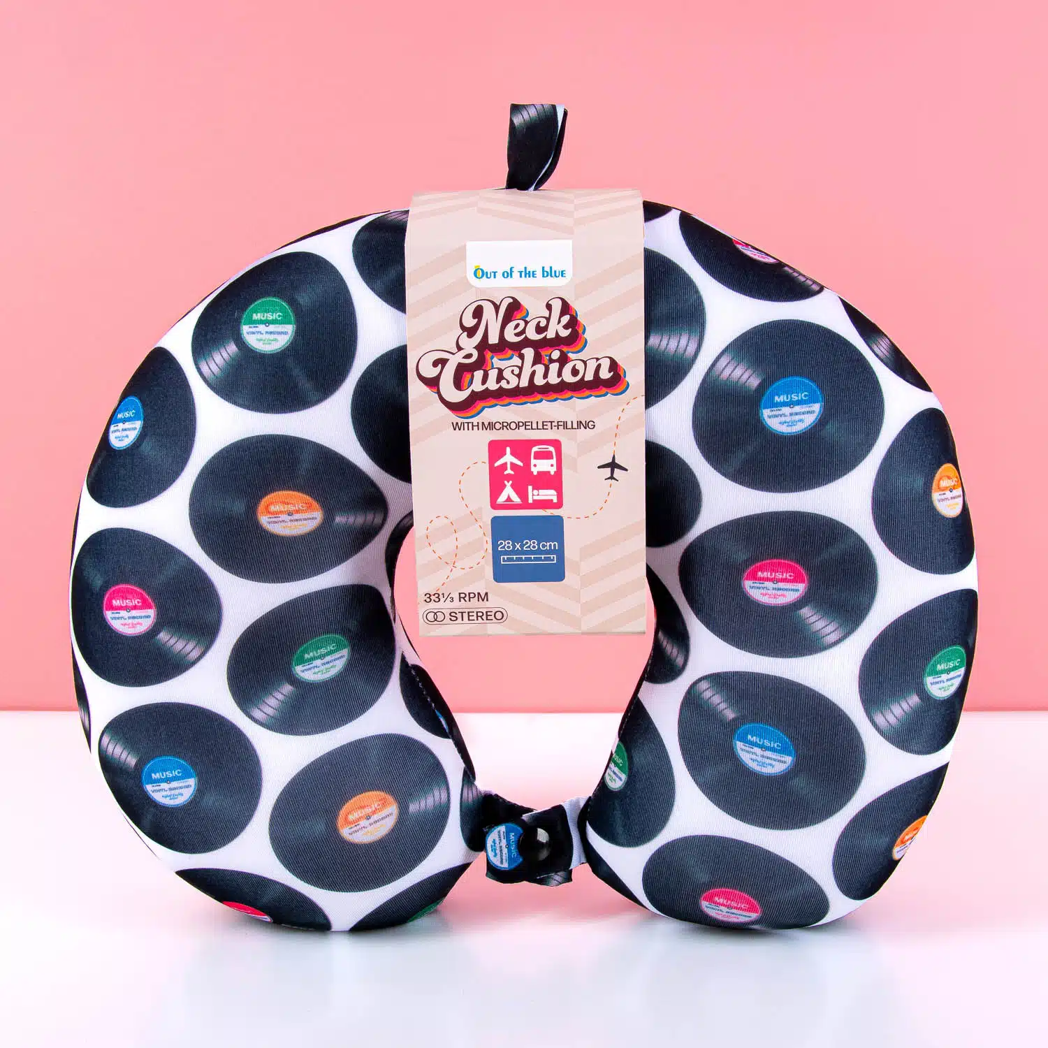 Het Elpee nekkussen zorgt ervoor dat je lekker comfortabel kan reizen. Op de stof staan afbeeldingen van allemaal elpees. Het zachte kussen met micro-pellet vulling biedt ondersteuning tijdens reizen en dutjes.