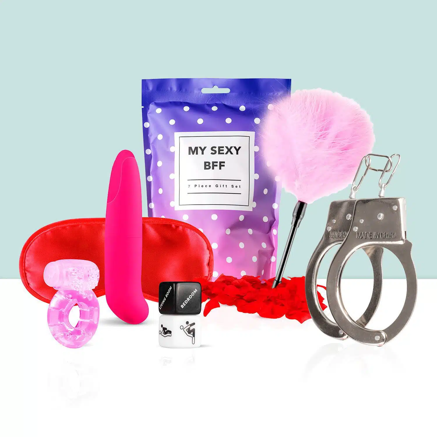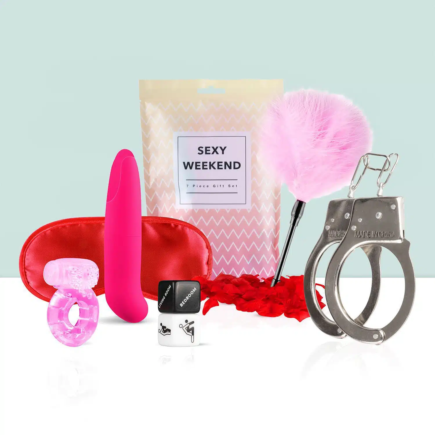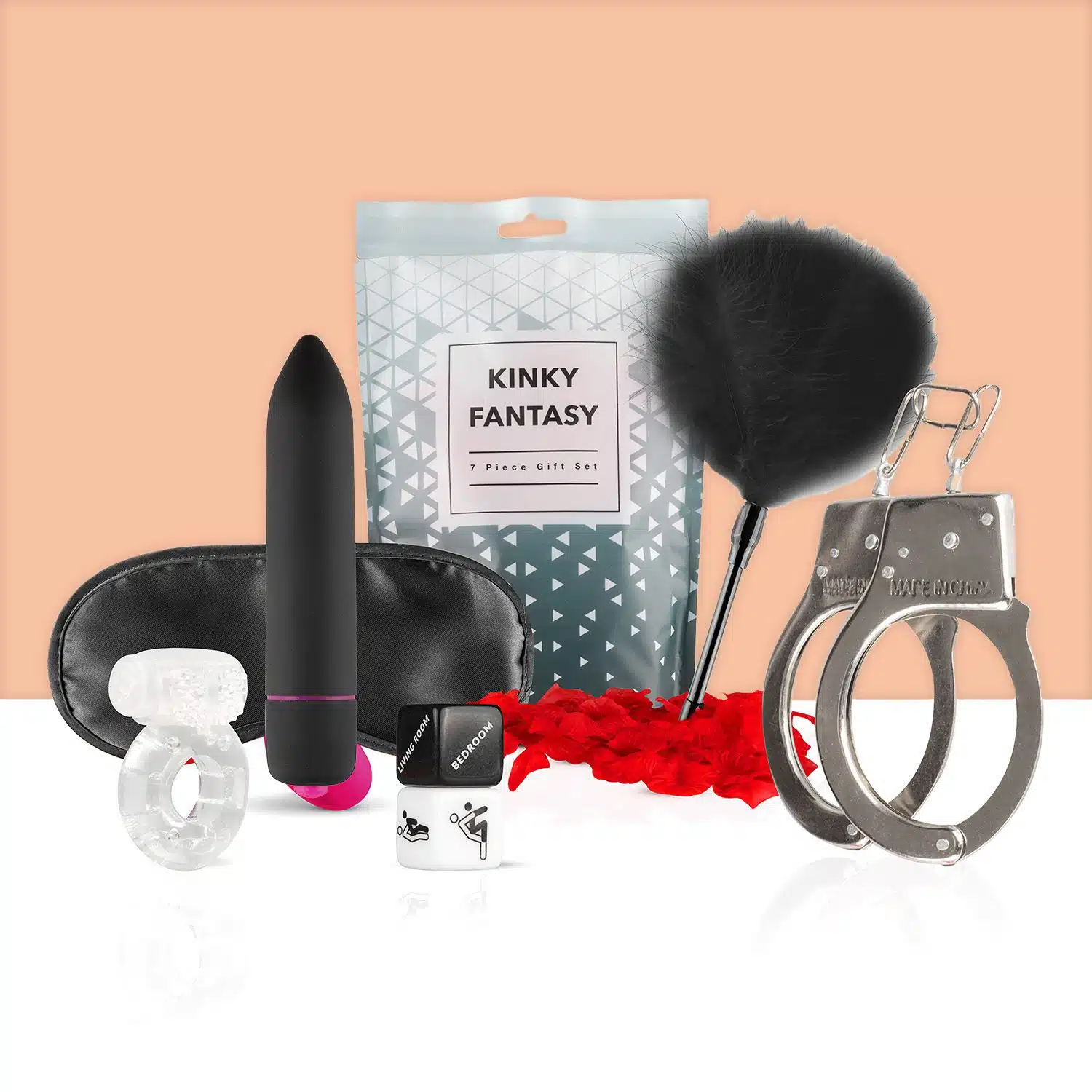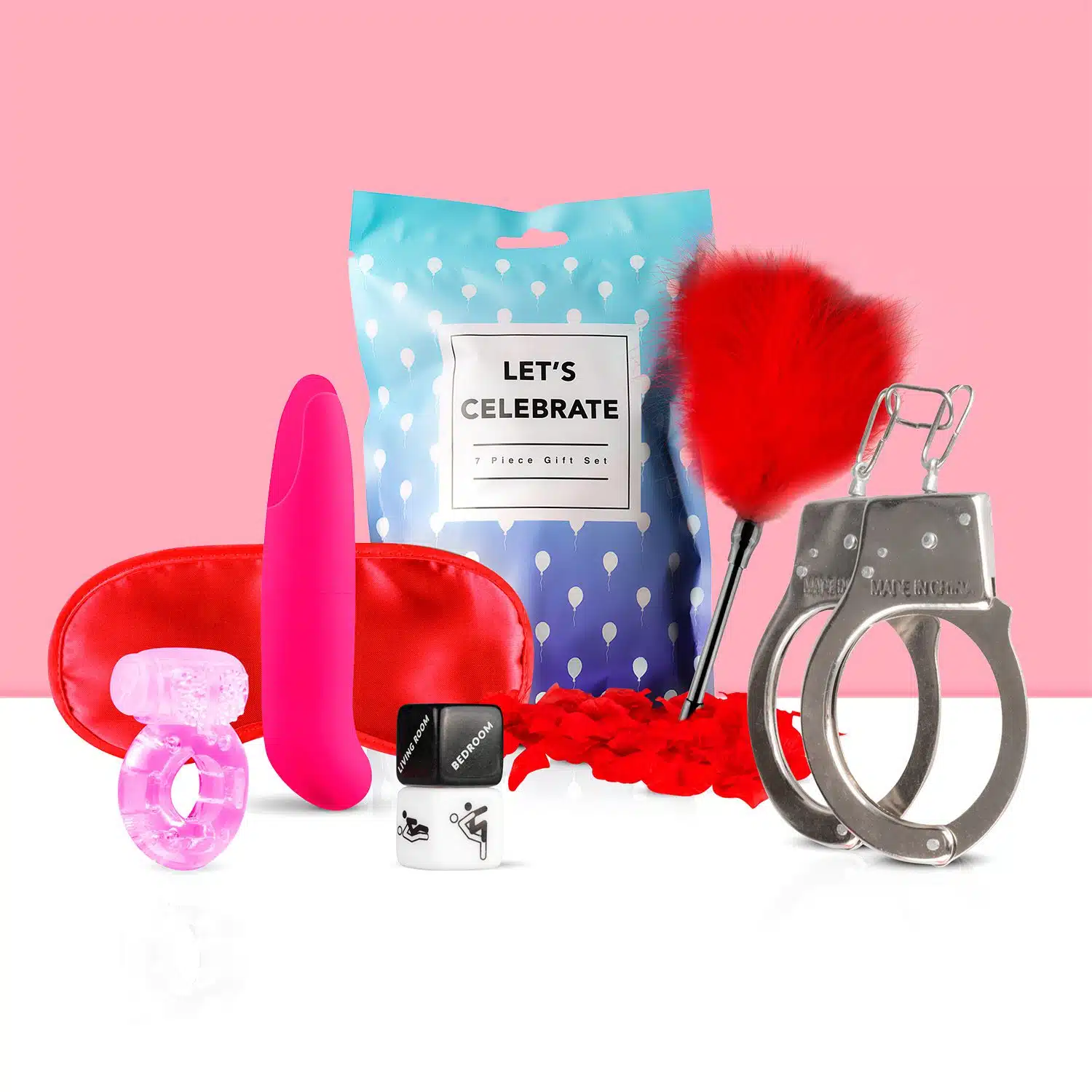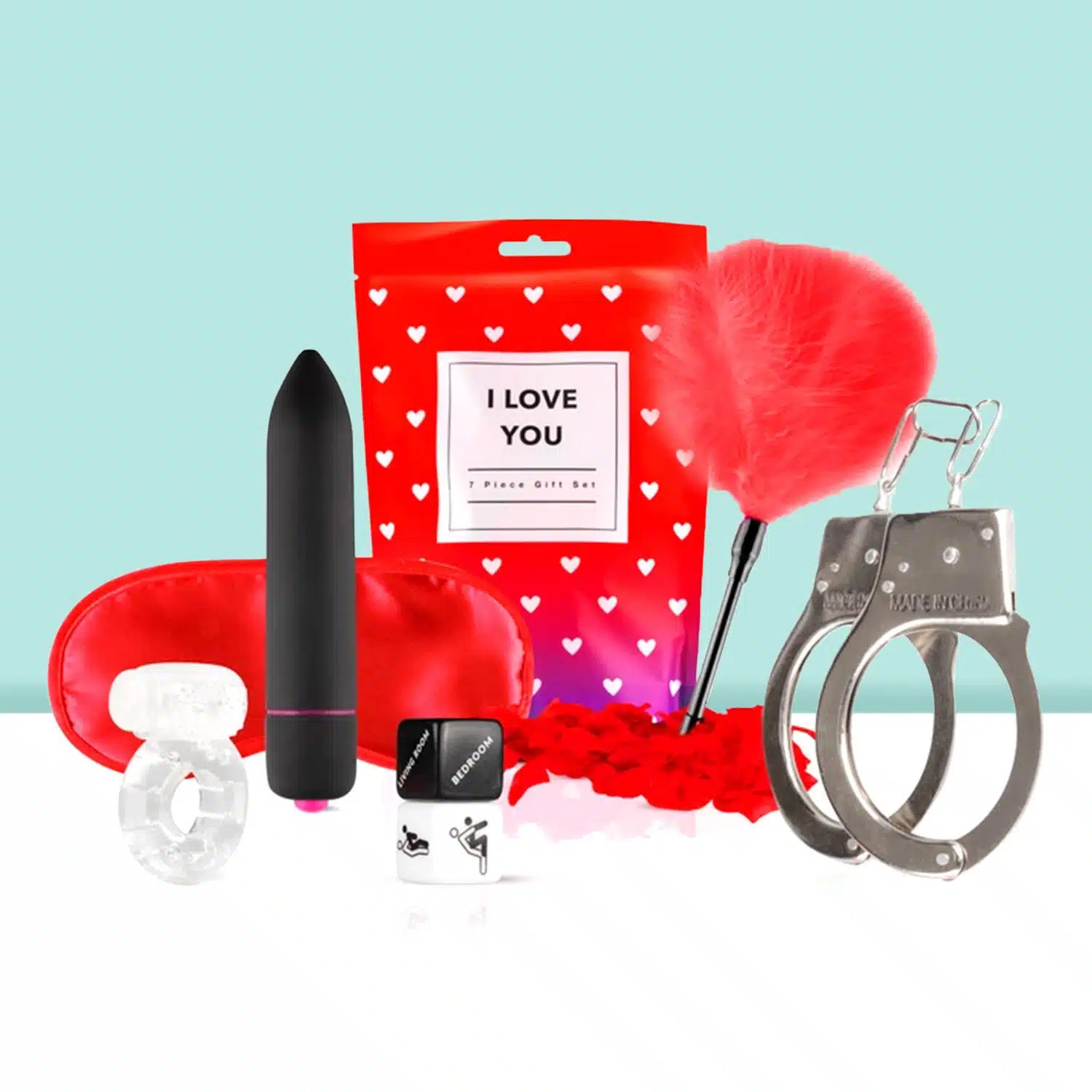 - Elke verpakking bevat: een mini vibrator, vibrerende cockring, seksdobbelstenen, handboeien, kietelaar, oogmasker en nep-rozenblaadjes