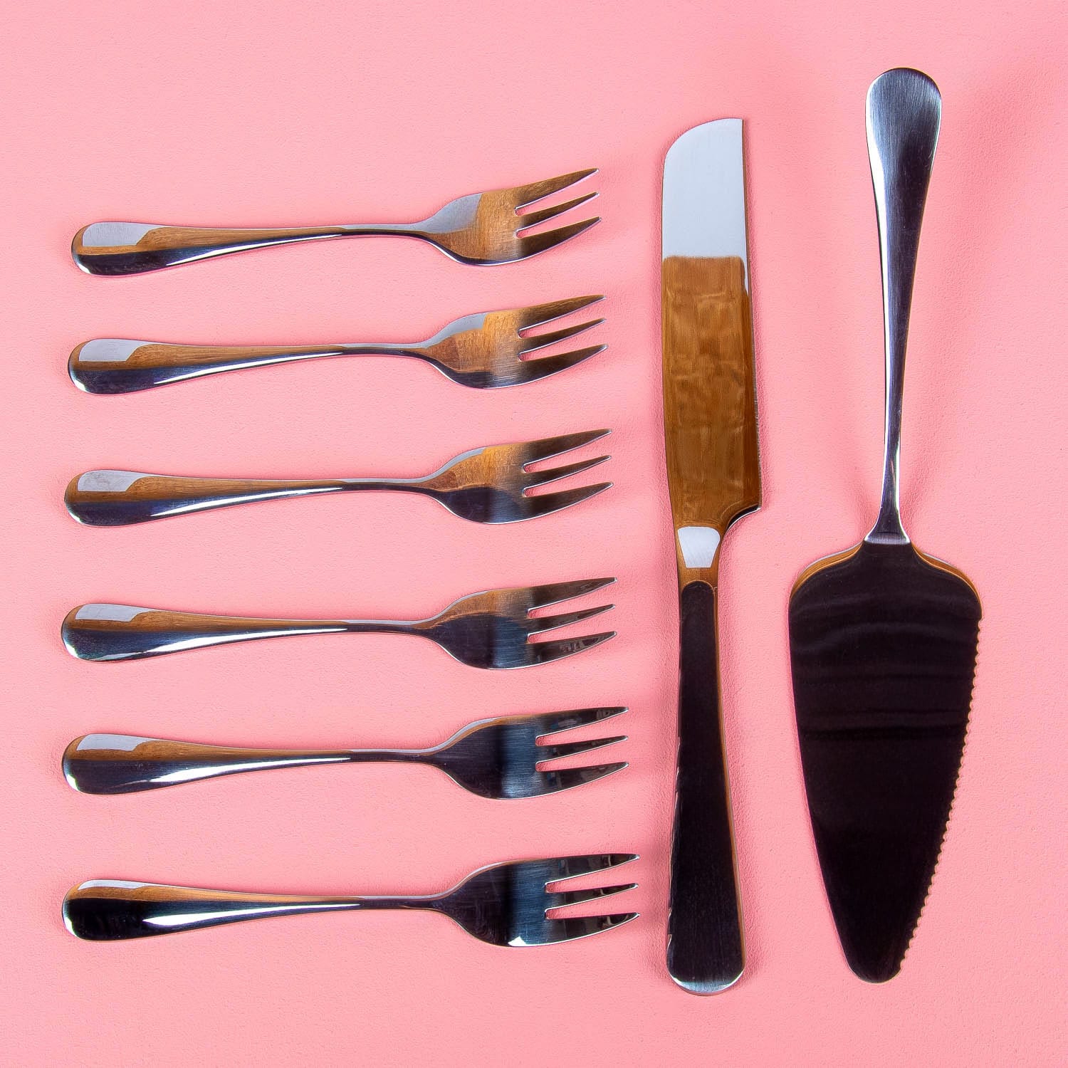 • Inclusief 1 taartspatel, 1 taartmes en 6 dessertvorken