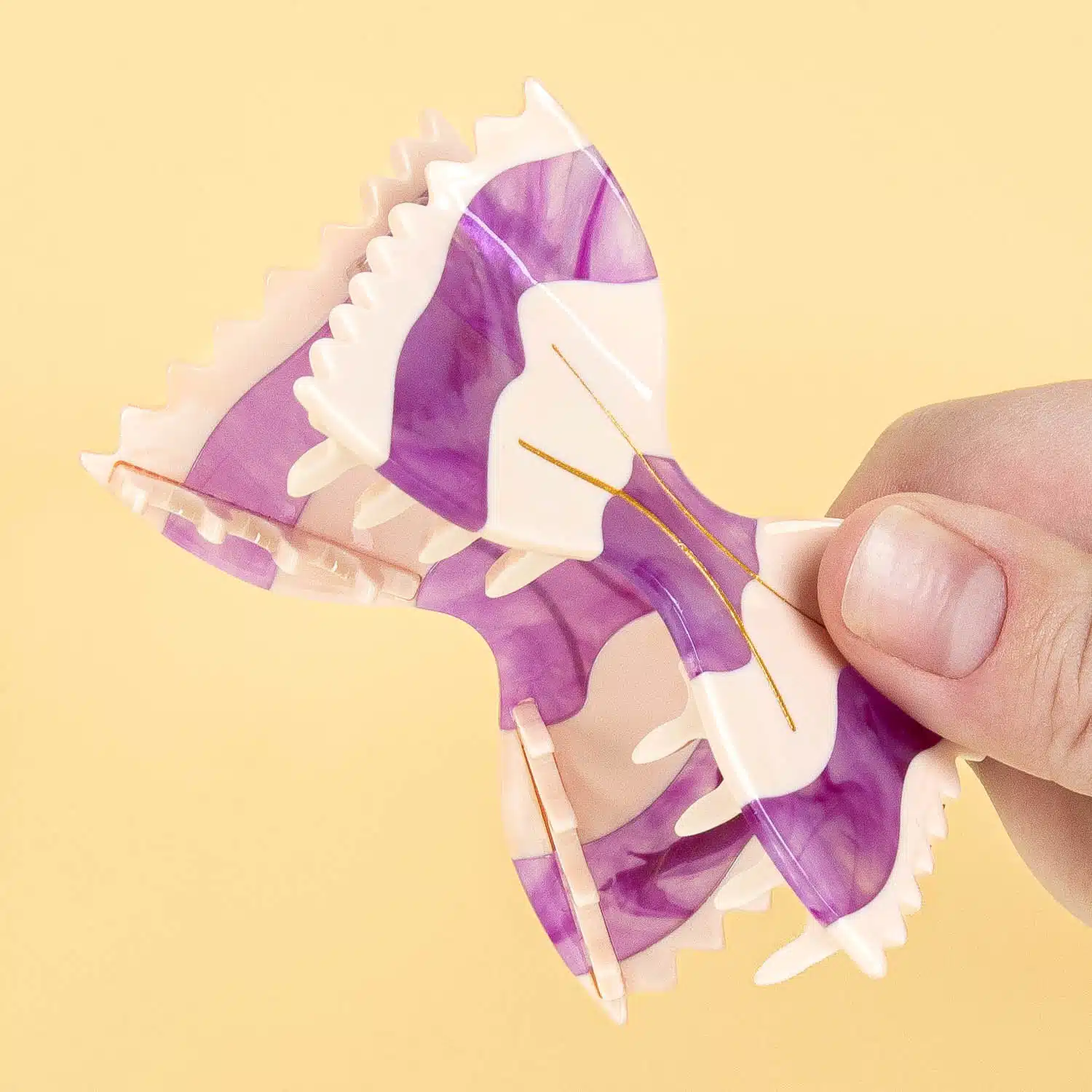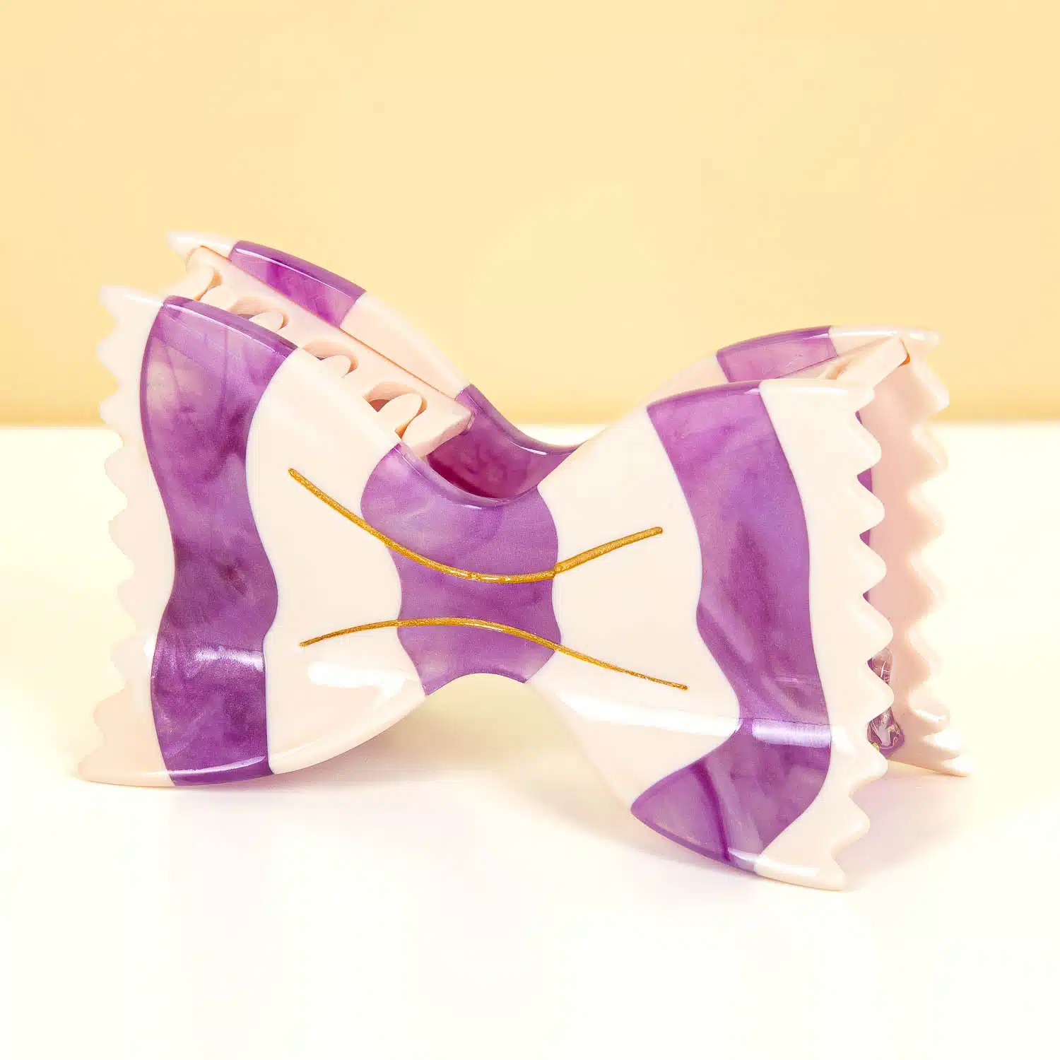 Is farfalle jouw favoriete pastasoort? Of ben je gewoon dol op grappige haaraccessoires? Dan is de Farfalle haarclip van Eat My Socks perfect voor jou! Deze hilarische haarklem heeft de vorm van farfalle, oftewel strikjespasta. Door de strepen en goudkleurige accenten is deze haarklem een grappige en vrolijke aanvulling op je outfit.