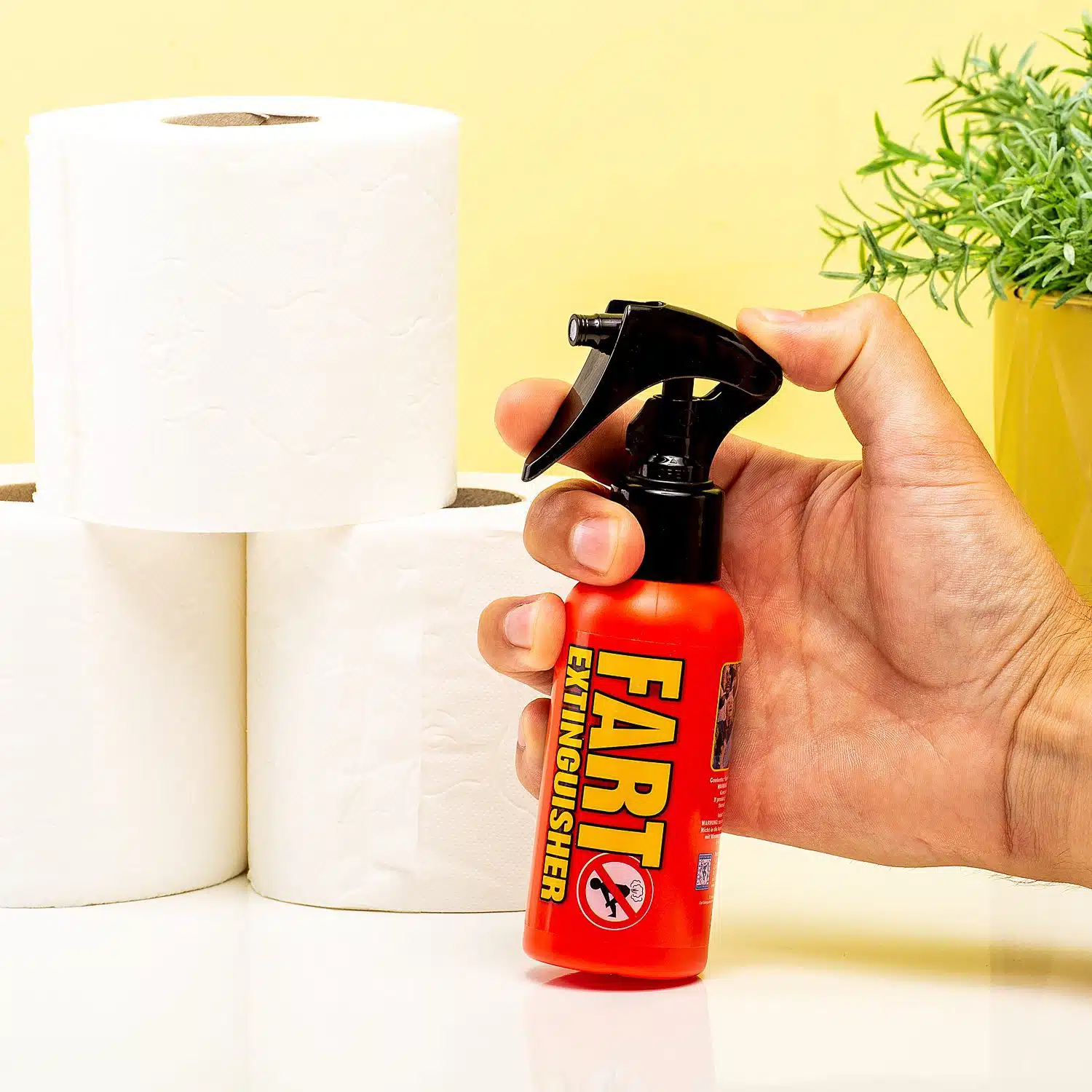 Heb je per ongeluk een dikke wind gelaten? Geeft niks, dat mag je gerust toegeven. Met de Fart Extinguisher luchtverfrisser is de geur zo weer verdwenen en ruikt je toilet weer naar bloemetjes. De luchtverfrisser mag dan op een brandblusser lijken, brandjes blussen doet hij niet. Poeplucht verbloemt hij echter als de beste.