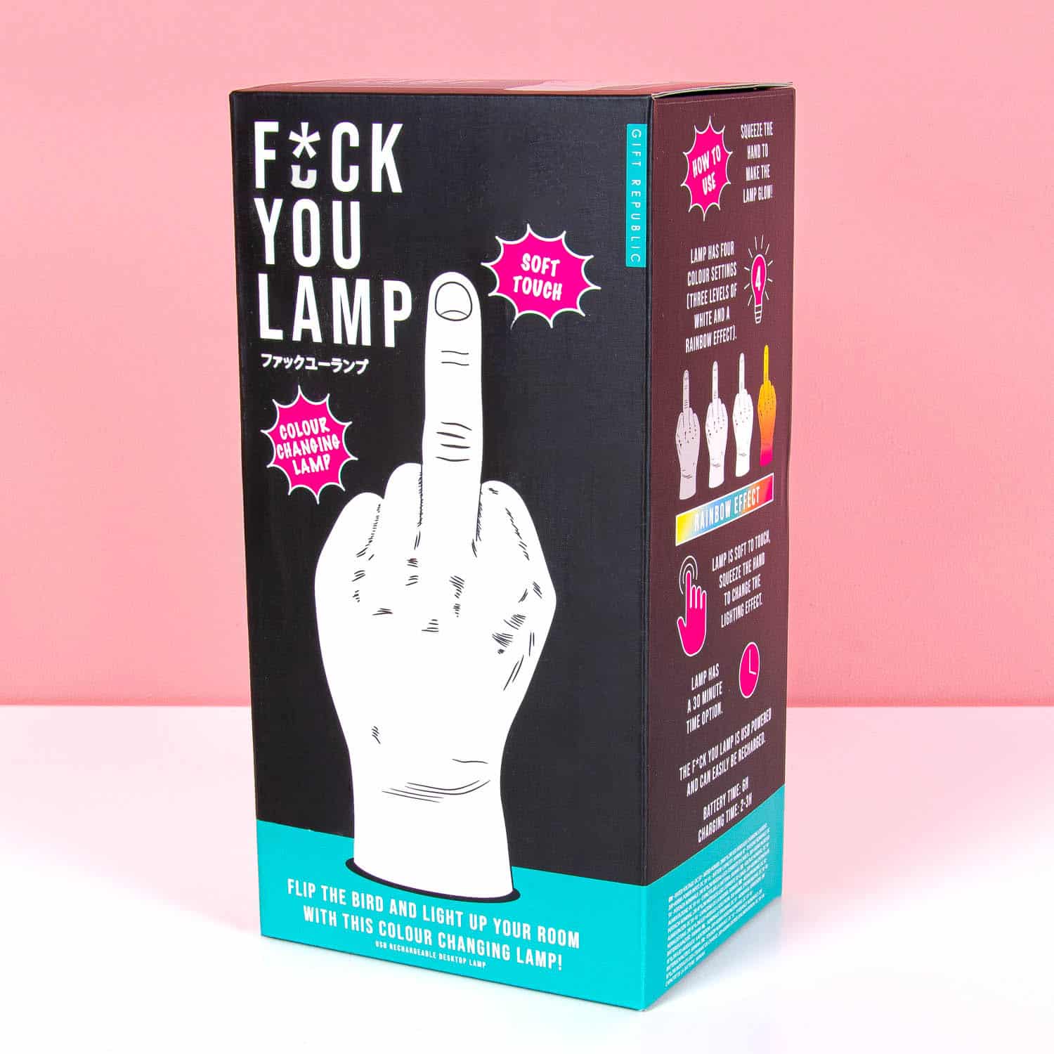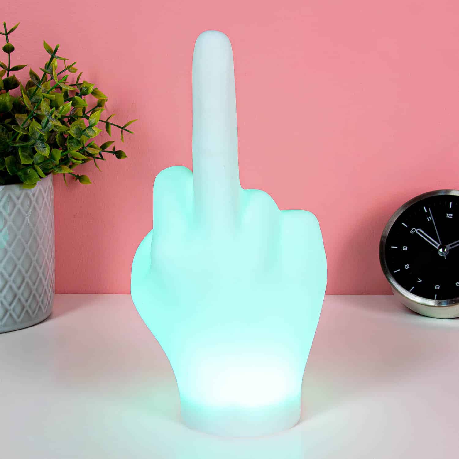 De F*ck You middelvinger lamp van Gift Republic is een lamp in de vorm van een opgestoken middelvinger die je kamer verlicht met attitude. Knijp in de hand om te wisselen tussen drie witte lichtstanden of kies voor het vrolijke regenboogeffect. Perfect cadeau voor wie van brutale humor houdt of gewoon een statement wil maken. Subtiliteit is overrated!