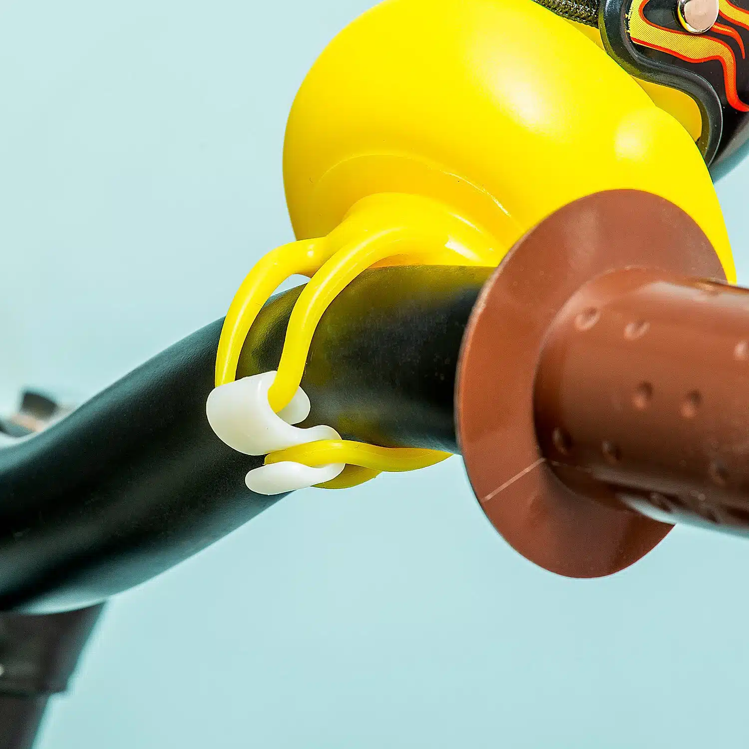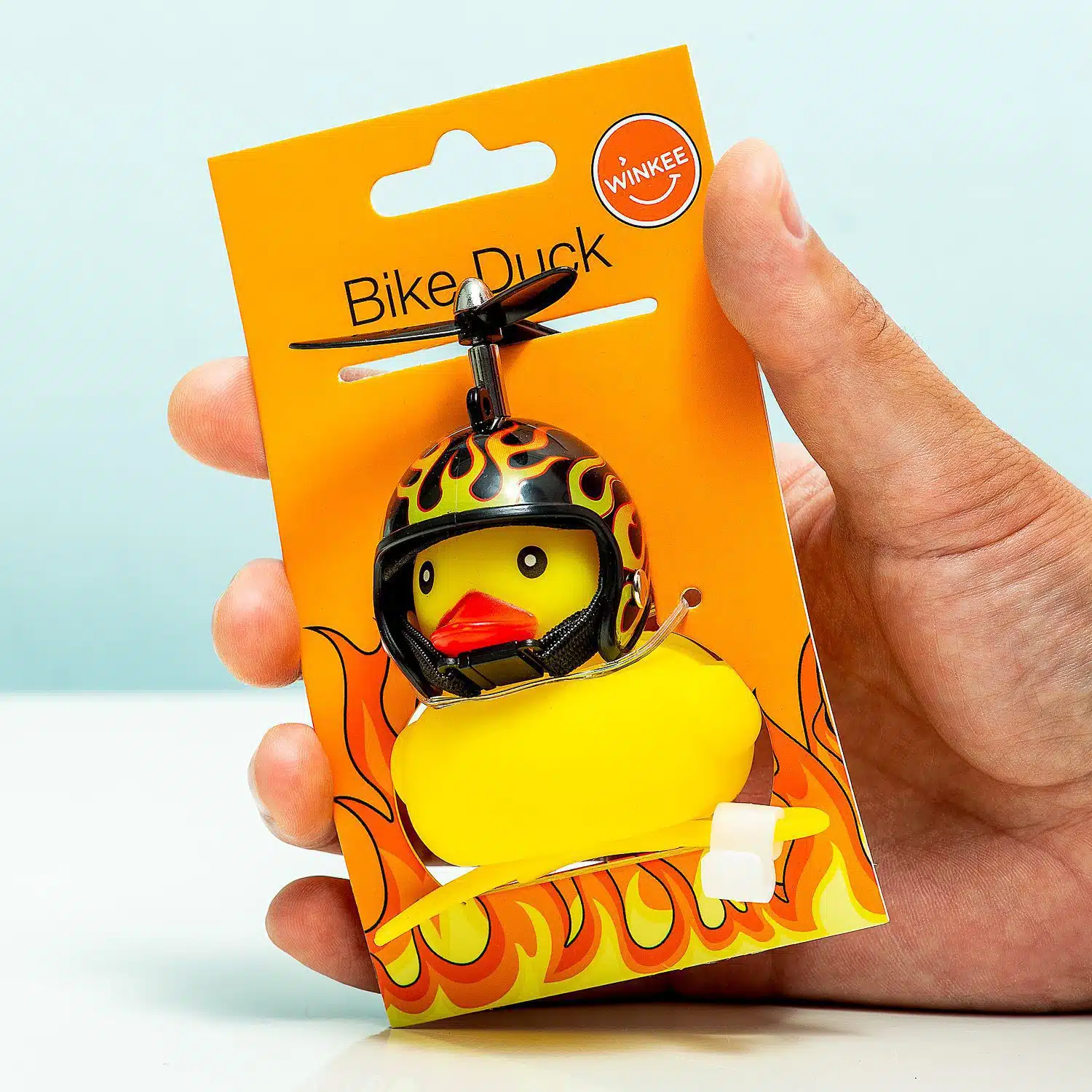 Je fiets herkenbaar maken tussen alle fietsen op het station? Dat is eenvoudig met de Fiets badeend op het stuur! Dit grappige badeendje is je trouwe metgezel op fietstochten. Speciaal voor de gelegenheid heeft hij zijn motorhelm en rotorbladen opgezet. Deze draaien rond als je fietst. Het badeendje is eenvoudig te verwijderen, zodat je hem niet kwijtraakt als hij op straat moet overnachten.