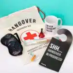 • Bevat een oogmasker, tandenborstel, tandpasta, beker met de tekst Never Drinking Again, deurhanger met SHH… Hangover in Progress, bel met tekst Ring For Ibuprofen en een opbergzak