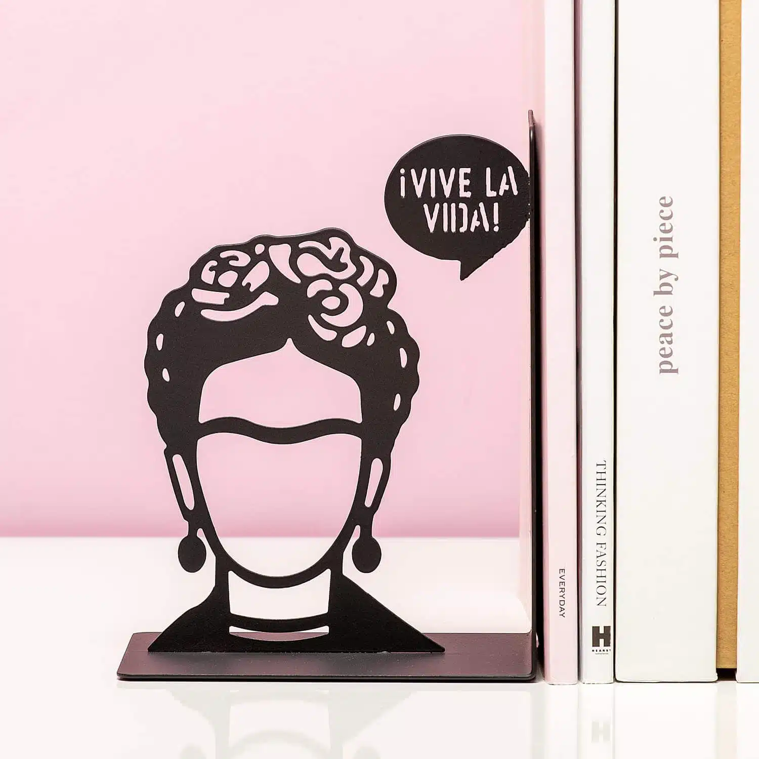 Je mooiste kunstboeken zet je natuurlijk trots in je kantoor of woonkamer, op een boekenplank of in de kast. En ze blijven keurig rechtop staan met behulp van de Frida Kahlo boekensteun van Balvi. De boekensteun is gemaakt van metaal en heeft het herkenbare kapsel én de unibrow van de Mexicaanse kunstenares. De tekst op de boekensteun: vive la vida, oftewel: leef het leven! Dat doe jij toch ook?