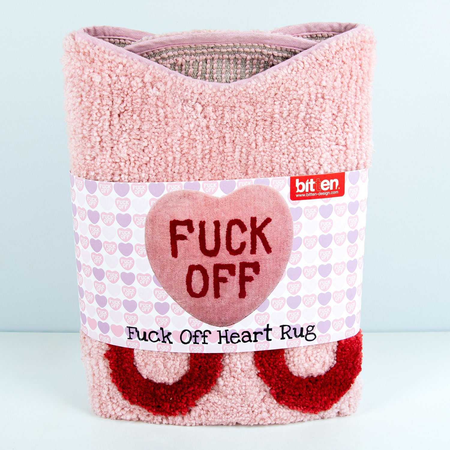 Wil jij je bezoek een welkom gevoel geven, maar niet teveel? Of wil je gewoon lekker met rust gelaten worden als je ligt te slapen? Maak het duidelijk met het Fuck Off hart vloerkleedje van Bitten. Dit grappige vloerkleedje ziet eruit als een snoeperig roze hartje en voelt heerlijk zacht aan je voeten. Hetgene dat het kleedje lekker edgy maakt, is de tekst die erop staat: Fuck Off. Grappig voor in de gang, naast je bed of bij je favoriete luie stoel.